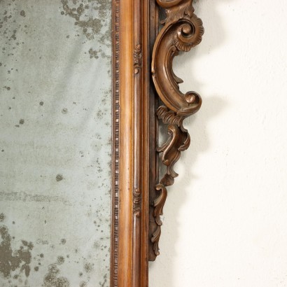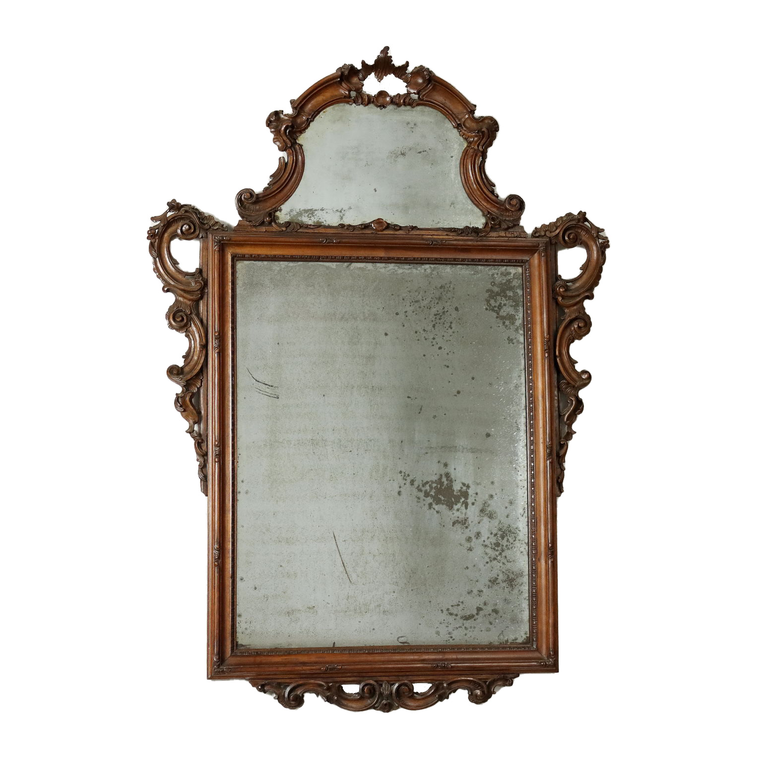 Miroir de style baroque en noyer, Italie, fin du XIXe siècle. Equipé de miroirs au mercure dont un placé à l'intérieur de la margelle. Orné de sculptures de style rocaille.