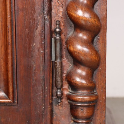 Buffet provençal à double corps avec façade en noyer et côtés en bois fruitier, France, début XIXe siècle. Façade à 4 portes ornées de panneaux, encadrements et demi-colonnes torses sculptées. Corps équipé d'une paire de tiroirs dans la bande ; panneaux également sur les côtés. Restaurations et remplacements.