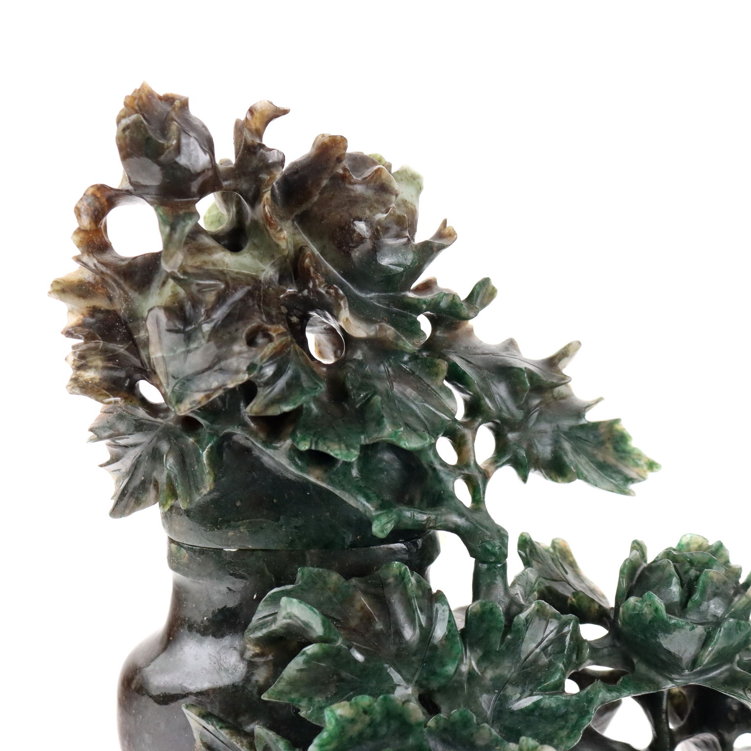 Sculpture en jaspe vert représentant un vase avec couvercle entouré de pivoines fleuries.