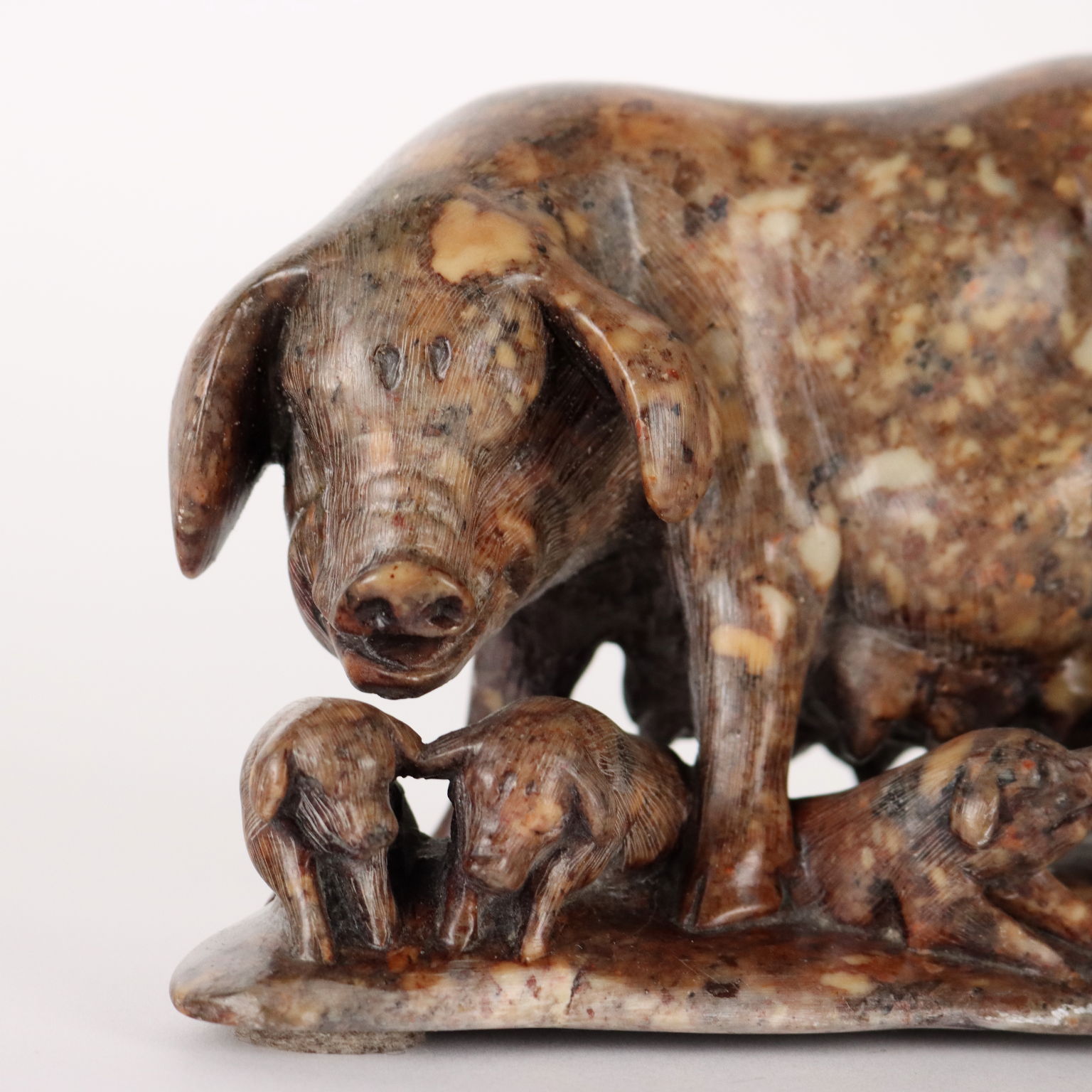 Sculpture en stéatite représentant un cochon, symbole chinois d'honnêteté et de volonté, veillant sur ses enfants.