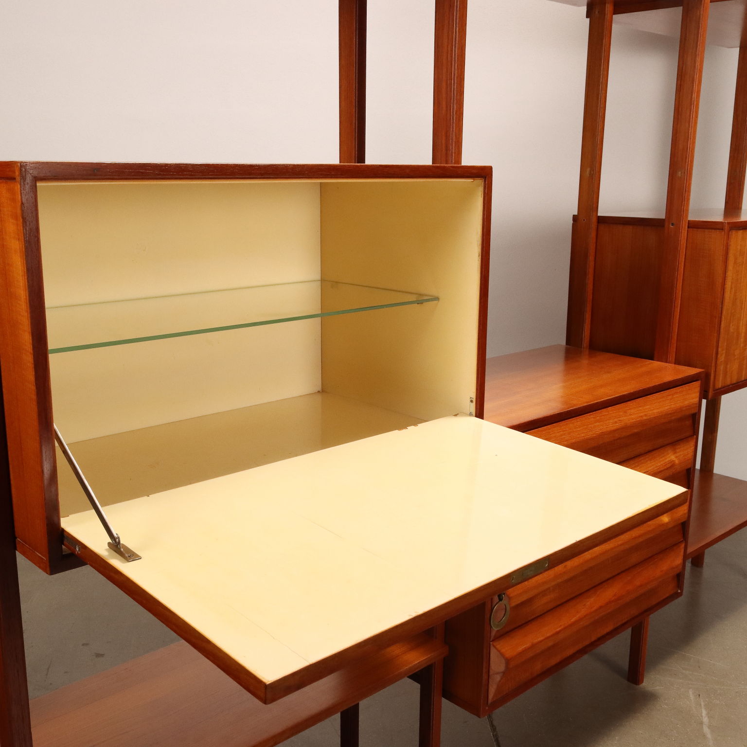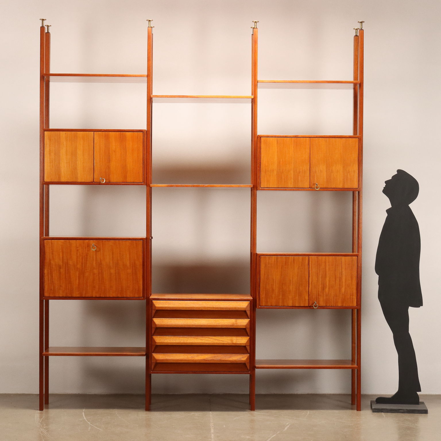 Bibliothèque avec ancrage au plafond, éléments de conteneurs et étagères en position fixe, ouvertures de conteneurs avec portes battantes, abattant et tiroirs apparents en bois plaqué teck. Un meuble très fonctionnel pour un espace de vie actuel et moderne. La bibliothèque a à la fois des étagères ouvertes pour les livres mais aussi des conteneurs pratiques, réussissant ainsi à répondre aux besoins esthétiques pratiques ; en fait, il occupe un mur sans le remplir mais offre en même temps la fonctionnalité de contenir avec praticité. Soigneusement restaurée par notre laboratoire, la partie bois retrouve ainsi la luminosité originelle de l'essence de teck.