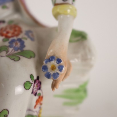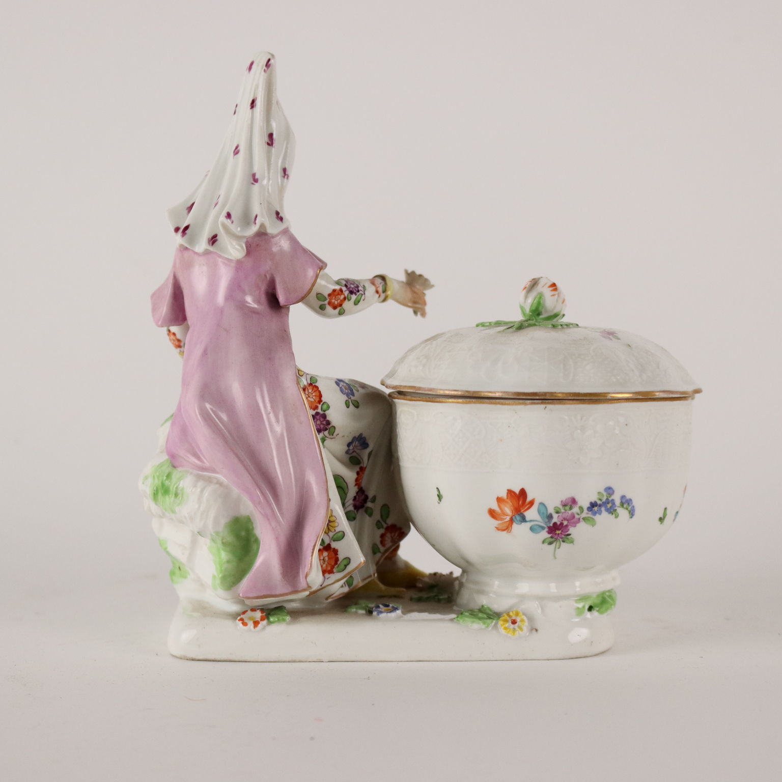 Sucrier en porcelaine à anse de couvercle en forme de fleur finement décoré de motifs végétaux et flanqué d'une dame. Sous la marque de base du fabricant.