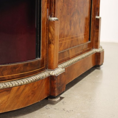 Buffet de la fin de l'époque victorienne, Angleterre fin 19e - début 20e siècle. Dessus à moulure noircie, façade profilée à trois portes, les deux latérales vitrées, la centrale incluse dans des demi-colonnes à chapiteaux corinthiens en bronze. Toute la surface est plaquée de bruyère de noyer avec des incrustations et des fils d'érable. Applications en bronze doré.