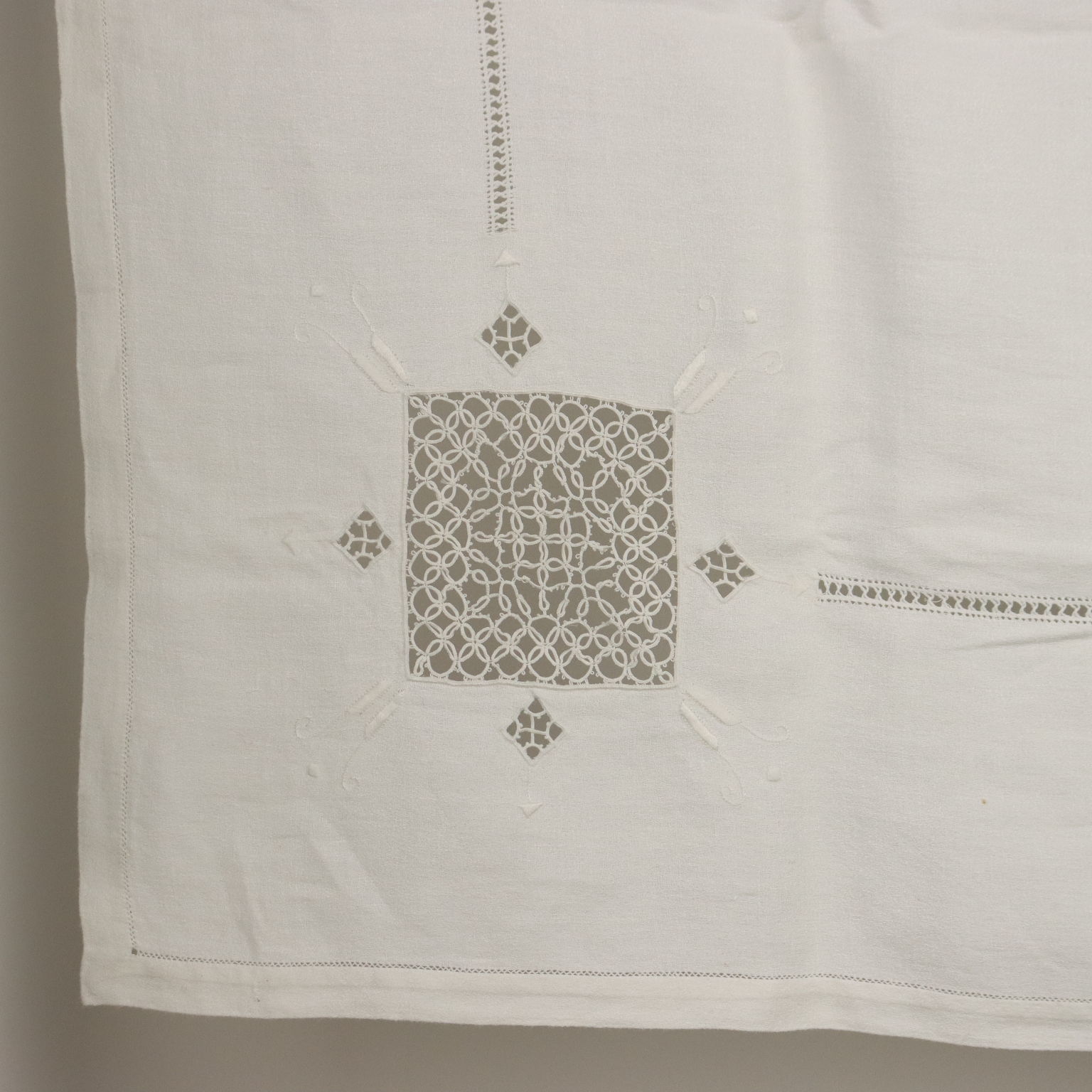 Nappe élégante avec empiècements frivolité et broderie au point bourdon Forme rectangulaire Couleur blanc Composition lin Petites imperfections Dimensions Nappe 192 x 166 cm Serviettes 49 x 51 cm