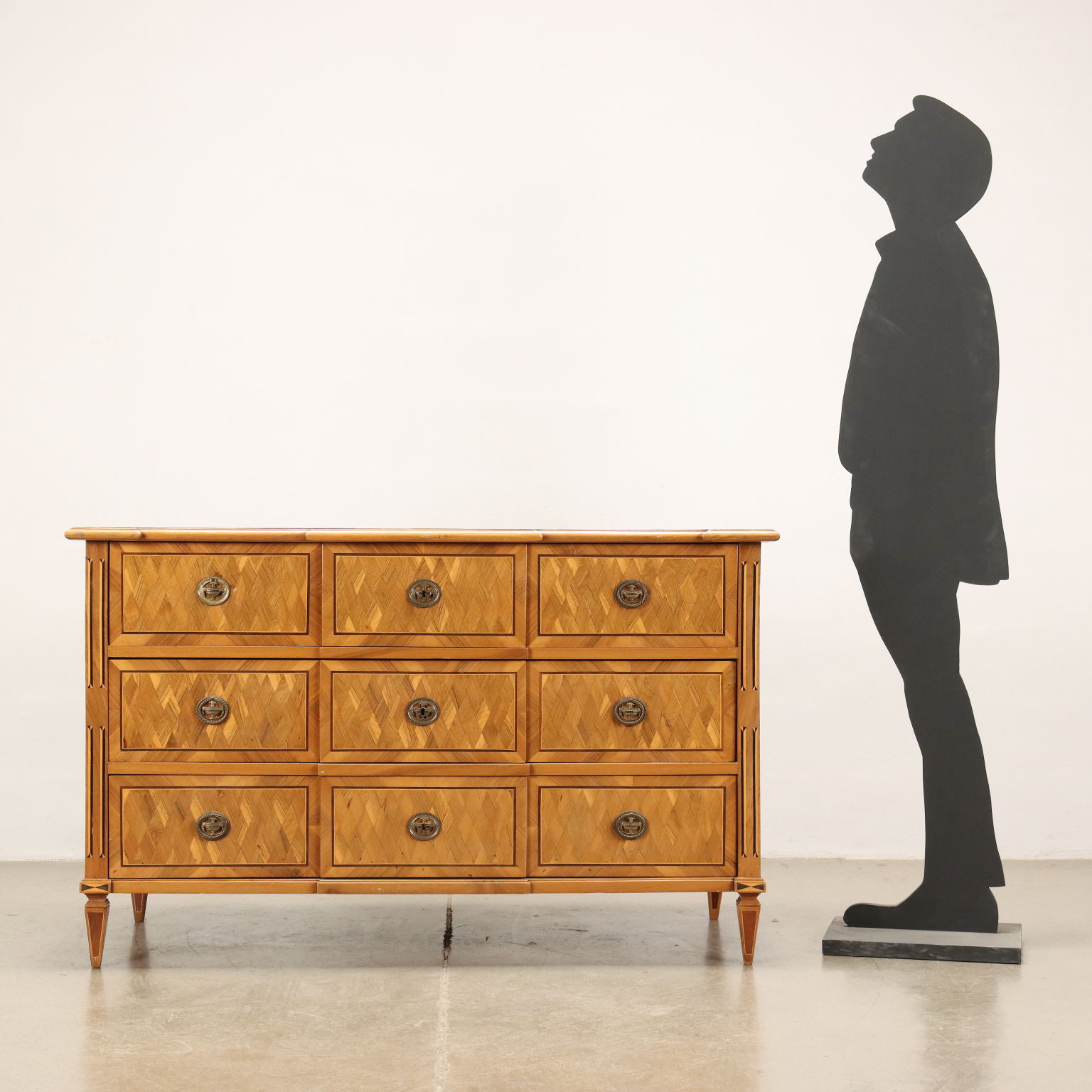 Commode néoclassique en placage de noyer, Allemagne. Dessus profilé et moulure. La façade brisée par un dossier central en relief, est composée de trois tiroirs. Le devant de celles-ci ainsi que les côtés, présentent des réserves ornées de marquetterie, contenues par des filets en buis et noyer noirci. Poignées de tiroir en bronze représentant des vases à tête de bélier, un pendentif manquant. Poignées et évents non contemporains. Une seule serrure centrale à double loquet permet de fermer les trois tiroirs en même temps. Montants décorés de filets de buis et de noyer noirci. Pieds de tronc - pyramidaux rétrécis par des colliers