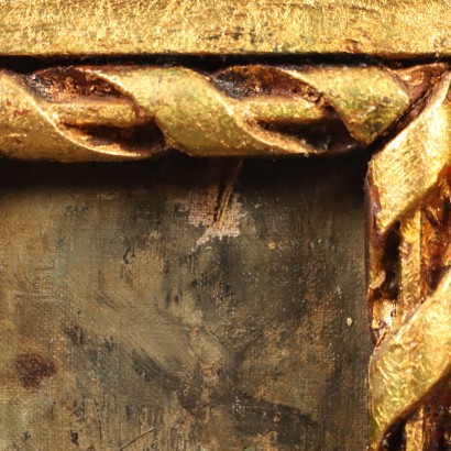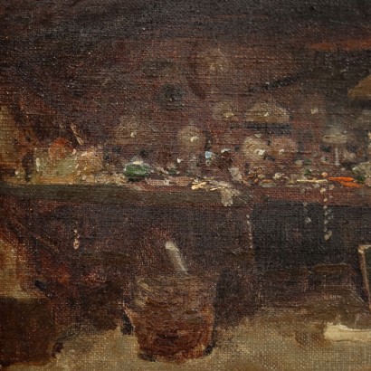 Peinture à l'huile sur toile. Signé et daté en bas à gauche. Ricciardi était un peintre napolitain prolifique considéré par certains comme la graine de l'impressionnisme napolitain ; il a peint des paysages marins, des plages, des vues, des paysages et des coutumes et traditions napolitaines de sa ville comme sujets principaux. Dans ses œuvres, le chromatisme intense, l'étude de la vie, l'abandon du dessin et la lumière limpide et laconique qui imprègne les scènes, révèlent la connaissance de l'impressionnisme, due à la présence à Naples de Giuseppe De Nittis. Cet aperçu de Naples a été reproduit à plusieurs reprises par l'artiste, et dans l'une de ces œuvres apparaît également le titre "Impression du vieux Naples", absent ici. C'est un aperçu intense de l'atmosphère d'une ancienne rue populaire napolitaine, animée par un marché peuplé de figures humaines, avec de vieux murs écaillés décorés de vêtements suspendus et de jardinières. L'œuvre est plutôt sombre, un monochromatisme brun prédomine, interrompu seulement par les couleurs plus vives des figures humaines ; la seule source de lumière provient des lumières artificielles allumées dans le magasin au bout de la rue. L'oeuvre présente un léger dommage dans le coin supérieur droit (petite coupure de la toile). Il est présenté dans un cadre contemporain.