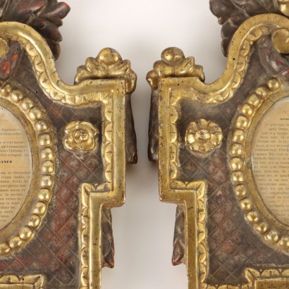 Paire de cartaglorias en bois sculpté, mecca doré et feuille d'or. Décors de rinceaux feuillagés, motifs végétaux et festons.