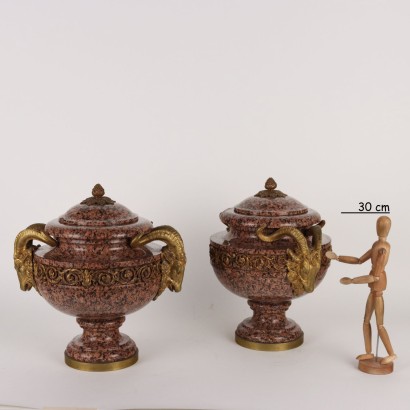 Paire de vases urnes en granit rose avec applications en bronze doré, Napoléon III, France, fin XIXe siècle. Couvercle amovible à prise "pomme de pin", motif grec de rinceaux d'acanthe, baies et éléments végétaux placés au point de circonférence maximale, profilant à la base. Chacune ornée d'une paire de têtes de béliers en bronze doré faisant office de poignées. Légers éclats.