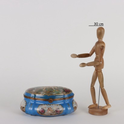 Coffret turquoise en porcelaine de Sèvres. Scènes avec angelots dans les réserves et compositions florales à l'intérieur. Profils et fermoir rocaille en bronze doré. Marque du fabricant sous la base.