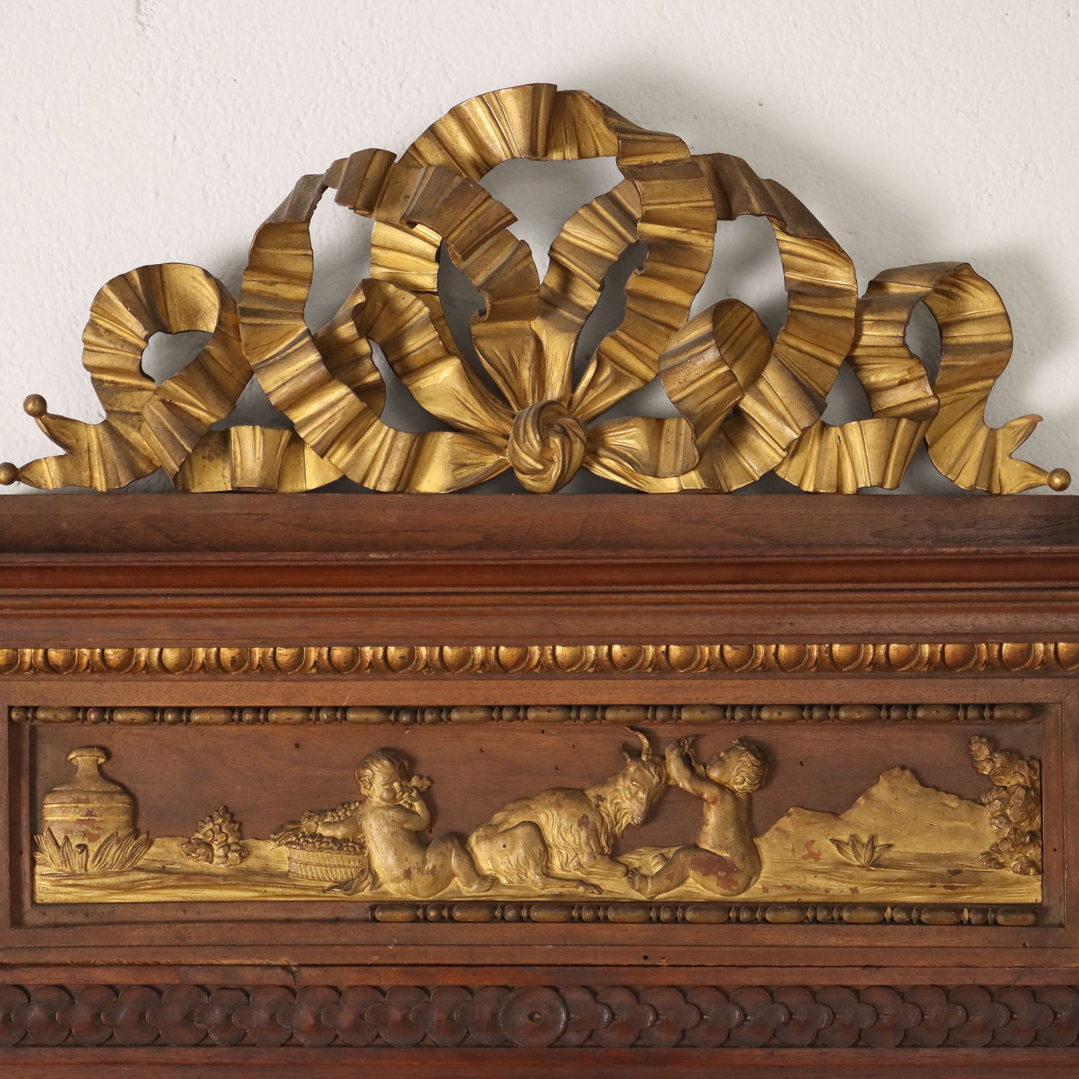 Miroir de style néoclassique à miroir biseauté et cadre en bois sculpté et doré, fleuron en forme de ruban sculpté et doré et scène bucolique avec angelots dans la réserve en dessous, angelots dorés sur les côtés. Lacunes. Italie, XXe siècle.