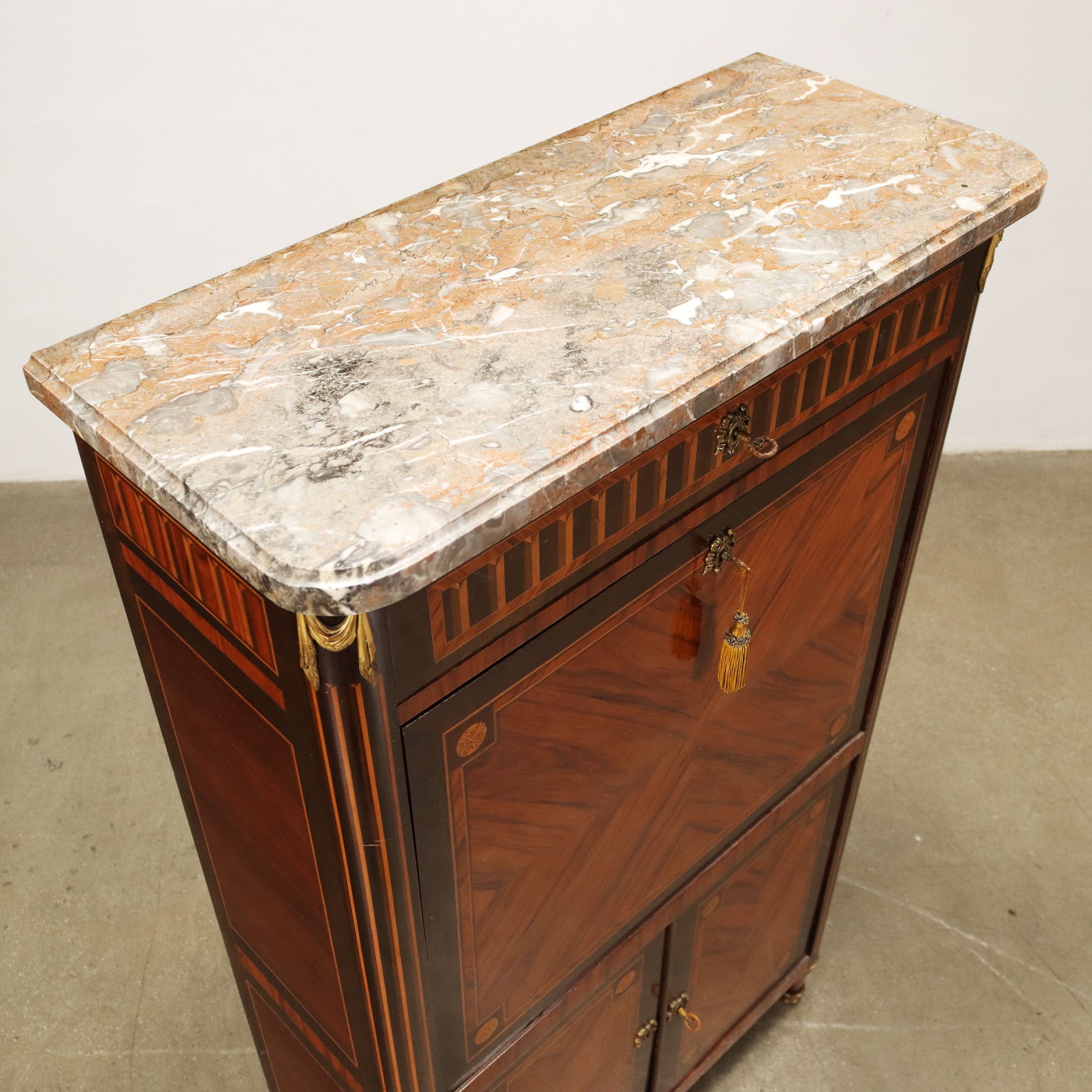 Secrétaire de style néoclassique à dessus de marbre brèche gris, façade à tiroir incrusté de motifs géométriques dans le bandeau supérieur, caisson dissimulant à abattant avec étagères en verre et deux portes sous étagères dissimulantes. Montants ornés de festons en bronze doré et pieds en verre. L'ensemble du meuble est plaqué de bois de rose quadripartite et d'essences diverses sculptées de rosaces dans les angles. Il y a une plaque mentionnant la marque "CH Jeanselme, Rue des Arquebusiers 7 et 9 Paris", une entreprise de fabrication de meubles à la fin du 19e et au début du 20e siècle. Charles Henry Jeanselme est né à Paris en 1856 et mort en 1930.