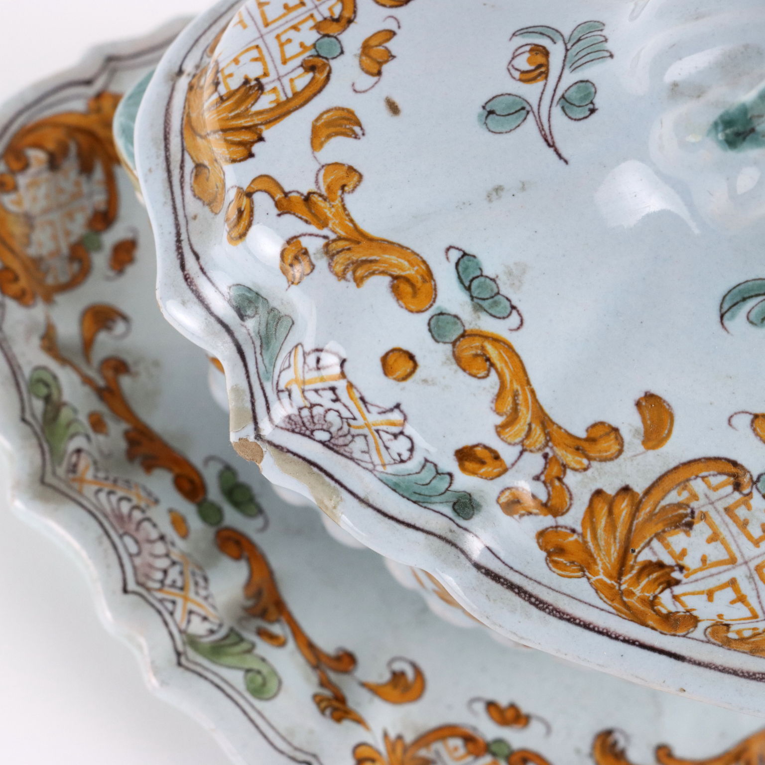 Soupière avec plat allongé en céramique majolique à décors de motifs végétaux et rinceaux feuillagés. Petites poignées de masque et poignée de couvercle en forme de fruit.