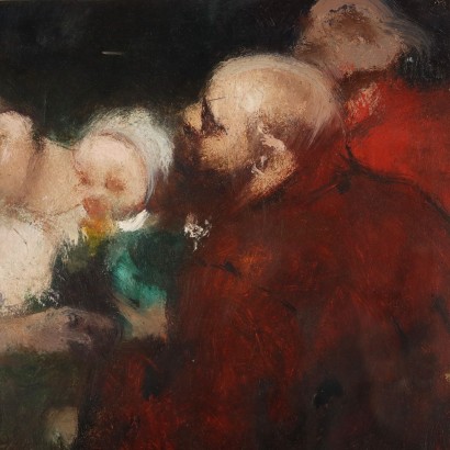 Huile sur carton. En bas à gauche se trouve l'inscription autographiée "Bozzetto per una copia", avec la signature et la date Noel 1910 ; le titre en bas à droite. Il s'agit d'un croquis pour une réplique avec des variations de la peinture homonyme réalisée par Carena en 1907, grand monumental (159 x 300 cm), exposé à la Biennale de Venise en 1909 et maintenant conservé dans les Musées Civiques, Galerie d'Art Moderne d'Udine, Certains des figures mouvantes apparaissent dans l'œuvre, précisément des voyageurs, représentant les différentes catégories de l'humanité, hommes et femmes, adultes et enfants, jeunes et vieux, mais tous voyageant dans la même direction. Par rapport à l'original, dans cette esquisse aux traits du visage encore indéfinis, les personnages sont placés dans des positions légèrement différentes, avec le jeune homme enveloppé d'un manteau rouge au centre, et la partie inférieure ainsi que le fond manquent. Les couleurs sont presque dures, vives, étalées en coups de pinceau rapides et aux contours indéfinis. Le tableau appartient à la phase picturale encore symboliste de Carena, inspirée du symbolisme français d'Eugène Carrière, période qui s'achève avec sa participation à la Biennale de 1912. L'œuvre est présentée dans un cadre contemporain.