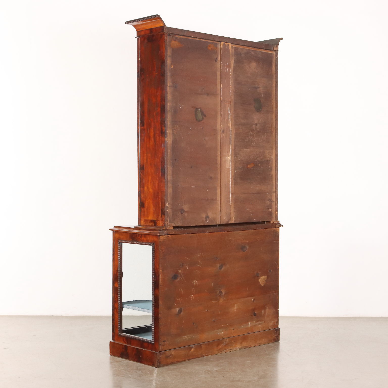 Vitrine à double corps plaquée en plume d'acajou avec façade à deux portes à vitres soufflées et cadre tourné dissimulant quatre étagères recouvertes de velours comme celles de la vitrine à deux portes ci-dessous. Des verres sont également présents dans les côtés de la base. Serrures en laiton avec marque au dos. Angleterre, deuxième quart du 19e siècle.