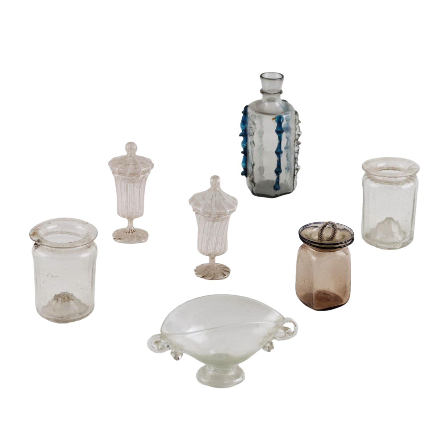 Groupe de 7 albarelli en verre de Murano de différentes tailles, formes et fabrication, Murano fin XVIIIe siècle. Fabriqués en verre incolore, certains ont des poignées et des éléments décoratifs en verre appliqué transparent et coloré, d'autres sont décorés de tiges de verre laiteux dans la technique dite du filigrane. Un albarello a de petites frites.