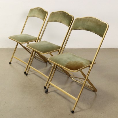 Suite de six chaises pliantes à structure en métal doré, assise et dossier en velours d'origine; trois dans les tons de vert, trois en orange.