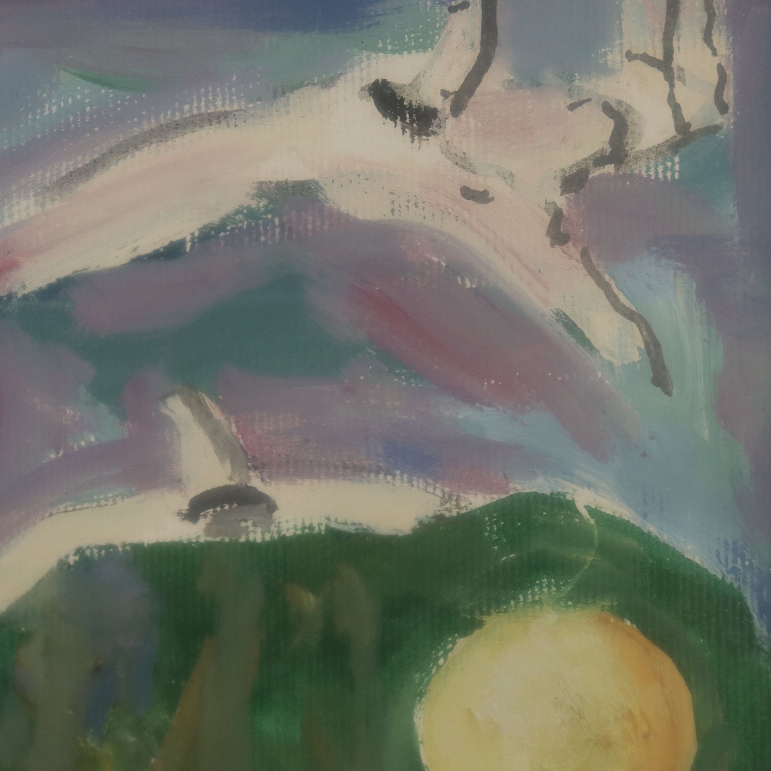 Huile (mixte) sur toile. Signé et daté en bas à droite. Au dos une autre signature, le titre, la technique, et une dédicace dédicacée par l'artiste à un ami. Mario Cortiello, peintre napolitain, élève de Gennaro Villani puis ami et collaborateur d'Umberto Lilloni, a participé avec son style personnel au renouveau de la peinture napolitaine, sans s'écarter de la tradition. Doté d'une invention féconde et d'une remarquable capacité de représentation, il a laissé une production riche et variée. Des vues de paysage ou urbaines sont récurrentes dans sa production, peuplée de nombreuses figures, souvent, dans le décor napolitain, de Pulcinella, représenté flottant sur des fonds oniriques, à tel point qu'il est défini comme le Chagall napolitain. Dans cette œuvre, Cortiello représente les fêtes du masque napolitain comme un moment ludique en compagnie des femmes nues omniprésentes. L'oeuvre est présentée dans un cadre.