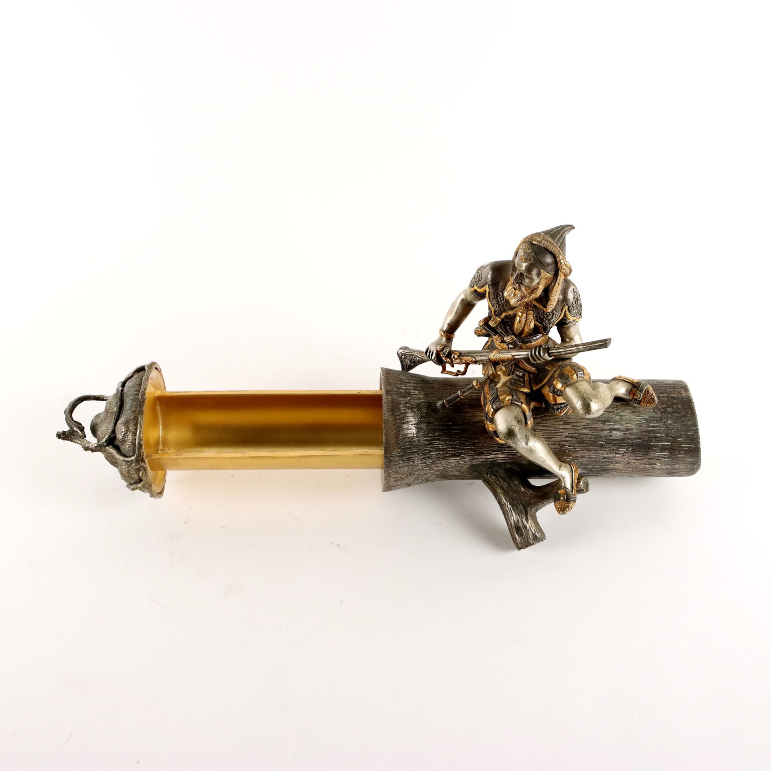 Porte document en bronze argenté et doré. Le porte-documents en forme de coffre est surmonté d'un soldat oriental avec fusil, hache et poignards. Signature gravée à peine déchiffrable derrière.