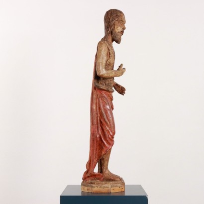 Sculpture en bois polychrome représentant Saint Jean Baptiste. Reposant sur une plate-forme basse, le saint est représenté avec une tunique à manches courtes avec un décolleté profond, tandis qu'autour des hanches et reposant sur une épaule il porte un manteau rouge ; le visage inexpressif est encadré par de longs cheveux bruns et une barbe.