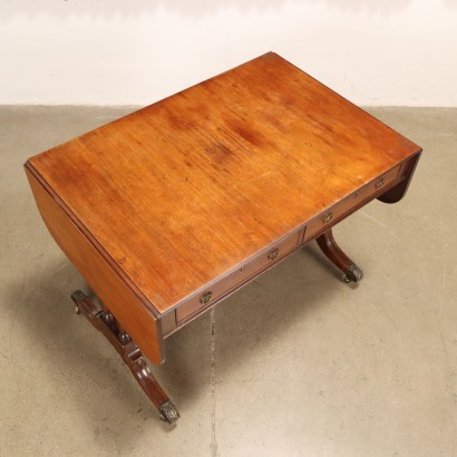 Bureau ouvert en acajou à dessus portant des bandes latérales, deux tiroirs dans la bande sous le plateau et des montants tournés reliés par une traverse centrale. Pieds recouverts de bronzes décorés d'un motif floral et roulettes en dessous. Angleterre fin XIXe siècle