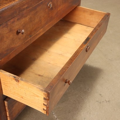 Abattant en noyer à porte roulante dissimulant meuble à huit petits tiroirs et façade à trois grands tiroirs sous-jacents. Intérieur en sapin, pieds légèrement ondulés. Bouton manquant. Italie première moitié du XIXe siècle
