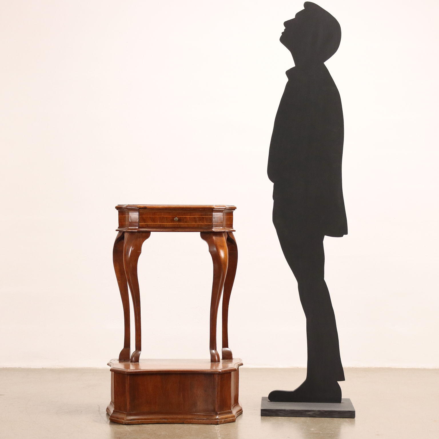 Genouillère en noyer et dalle de noyer, Ferrara milieu du XVIIIe siècle. Dessus et bande sous-plateau filetés en érable, tiroir, pieds ondulés et compartiment en partie basse. Intérieur en sapin.