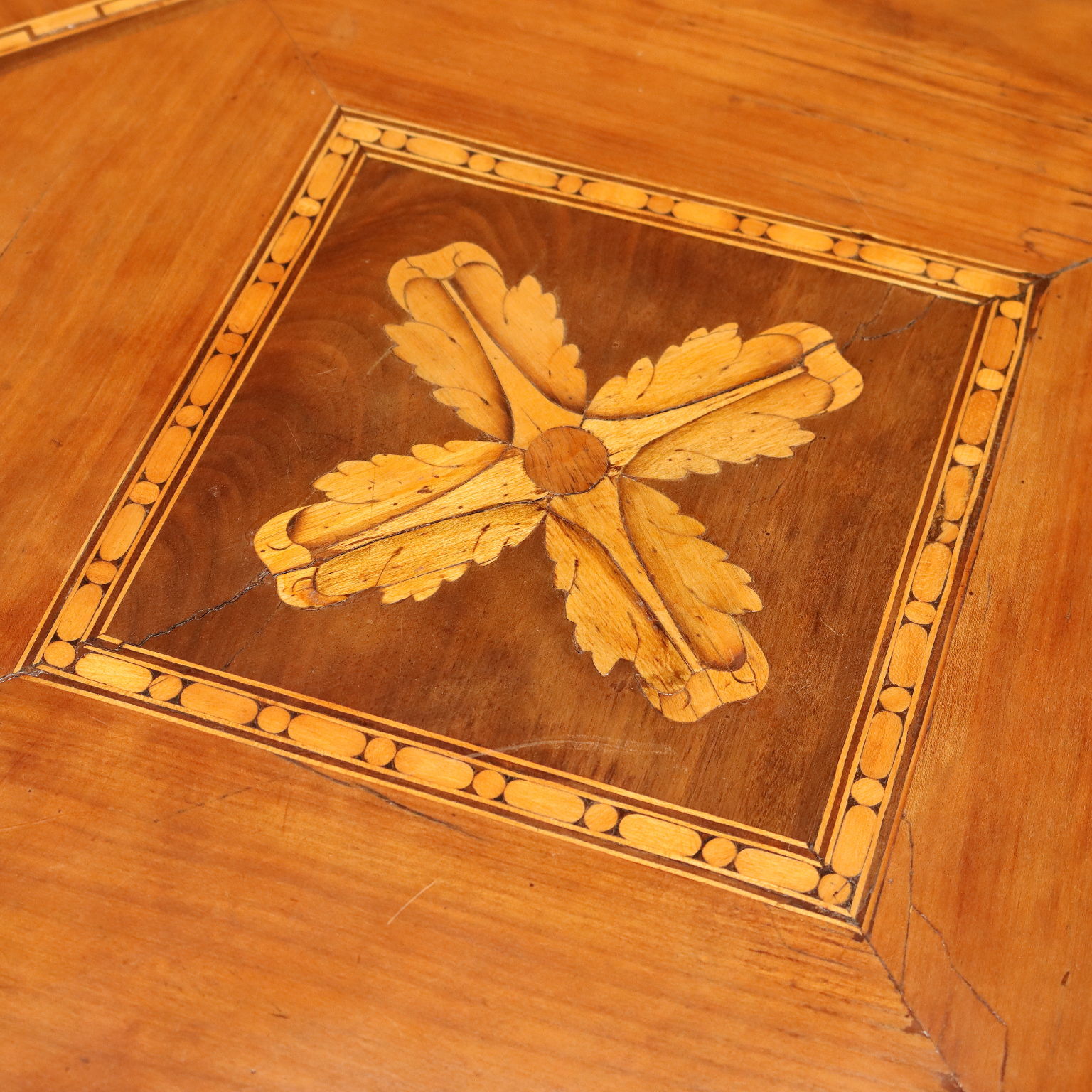Secrétaire ouvert néoclassique en merisier, Haute-Vénétie, fin du XVIIIe siècle. Plateau plaqué en merisier avec réserve quadripartite dans une bordure grecque et élément central rhomboïdal incrusté d'une rosace en érable. Tiroir dans le bandeau, pieds tronconiques cannelés, pieds piriformes. Filetage noyer, érable et cerisier; intérieur en épicéa.