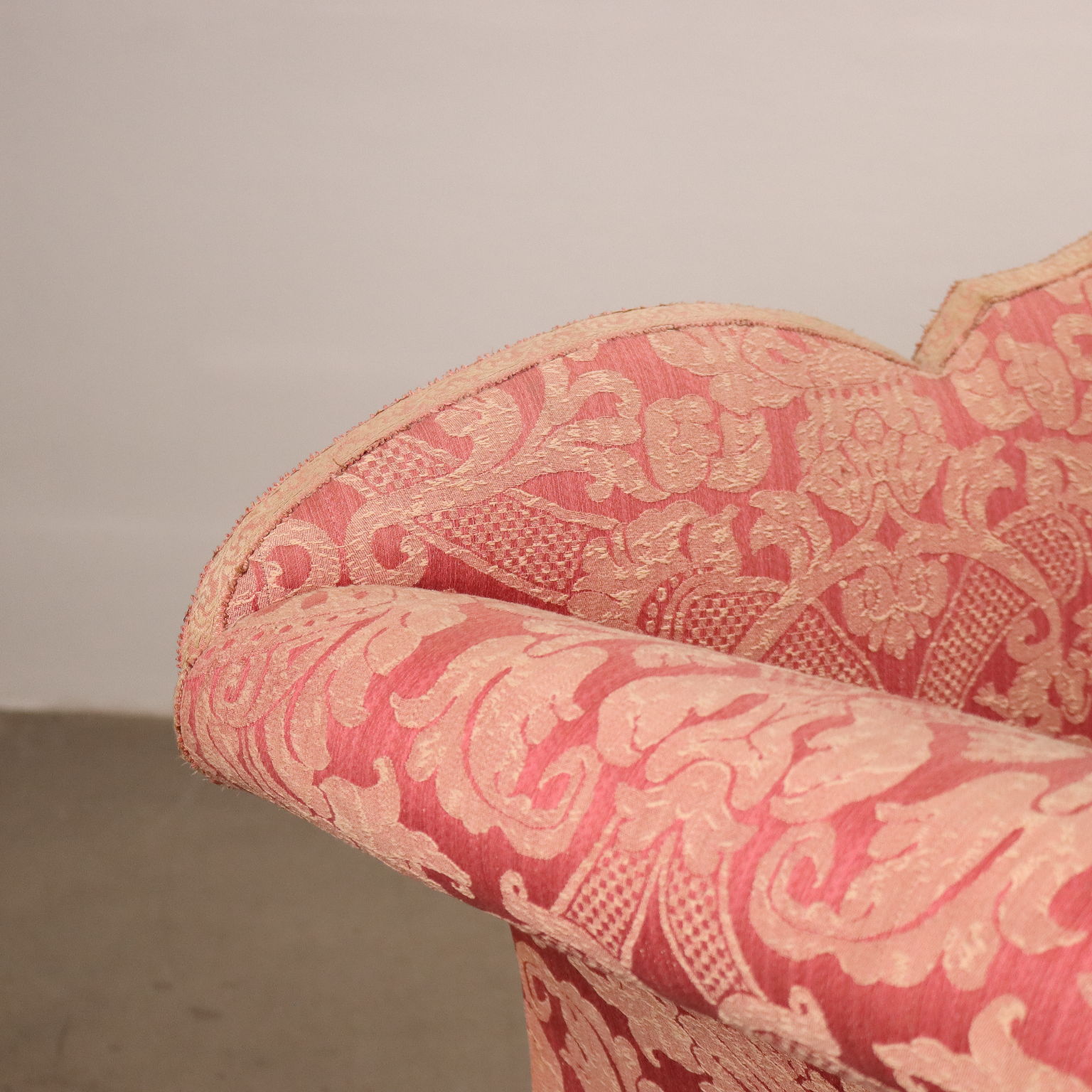 Canapé baroque à oreilles en noyer, Lombardie milieu du XVIIIe siècle. Accoudoirs courbés, pieds ondulés finis ouverts ; sculptures de feuilles et de coquillages sur les bandes et les jambes. Dossier, accoudoirs et assise rembourrés. Pieds arrière avec restaurations.