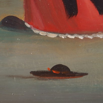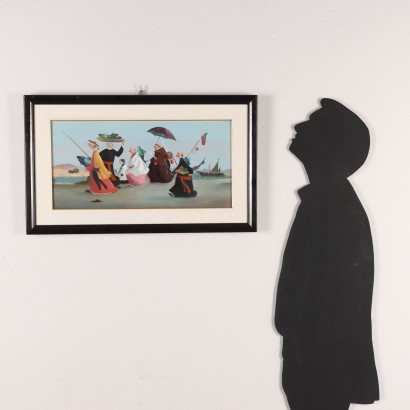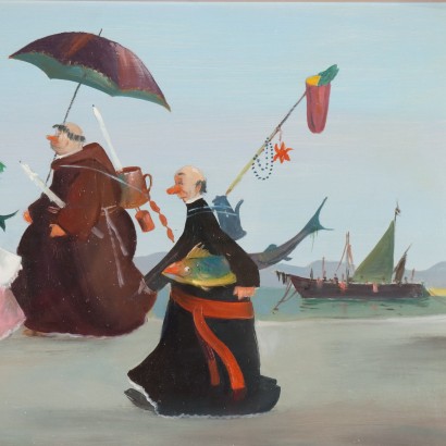 Huile sur table. Signé en bas à droite. C'est l'œuvre de l'artiste Rapallo Pietro Ardito, qui s'est imposé comme dessinateur et caricaturiste, peintre et dessinateur. Aussi dans ses oeuvres picturales la matrice est celle de la caricature : prélats et clercs se retrouvent souvent comme sujets, comme dans cette scène où Ardito propose une belle procession de clercs suivant un évêque... de retour d'une journée de pêche, avec des trophées de poissons bien en vue. Dans le cadre.