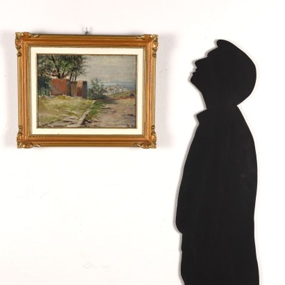 Peinture à l'huile sur toile. Signé en bas à droite. Peintre napolitain, mais aussi muséologue et professeur d'arts figuratifs, Dalbono s'est formé au mouvement du vérisme napolitain qui faisait référence à l'École de la Résine. Il aimait le paysage, qu'il dépeint d'après nature, préférant les heures de l'aube avec ses jeux de lumière ; mais il a aussi produit de nombreuses scènes de genre, avec des sujets populaires bourgeois, animés par différentes figures et toujours avec Naples en arrière-plan, ses vues et ses paysages, racontés avec des atmosphères étouffées, pleines de poésie. Dans ce petit paysage, Dalbono offre un aperçu des collines, avec des ruines architecturales : sur la droite s'ouvre la vue d'un promontoire surplombant la mer habité par une ville blanche. L'oeuvre est présentée dans un cadre.
