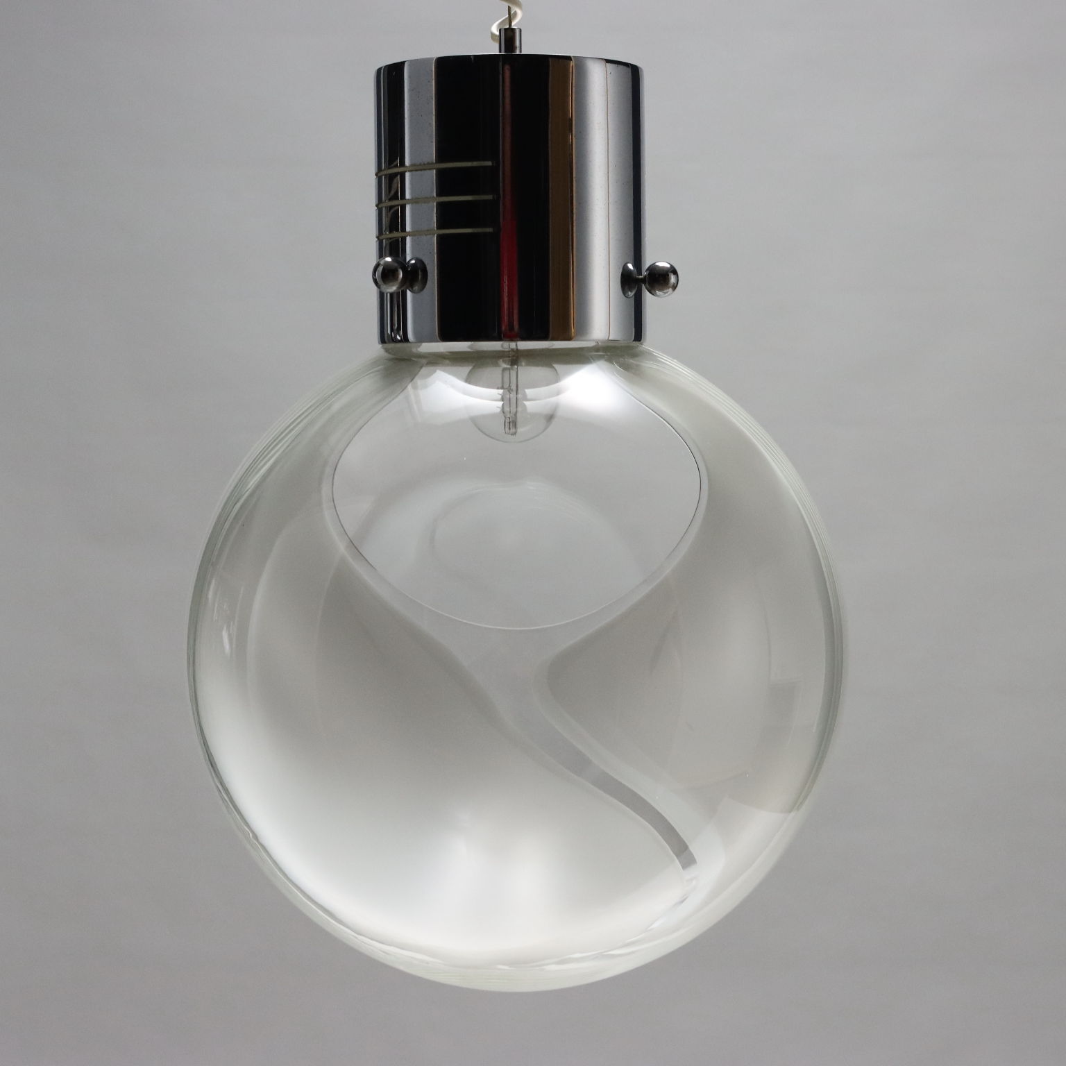 Lampe de la série "Membrana" de Toni Zuccheri en métal chromé et verre soufflé. La lampe met en valeur la beauté du verre soufflé. Cet article est indiqué comme point lumineux central pour un salon qui veut rappeler le style vintage.