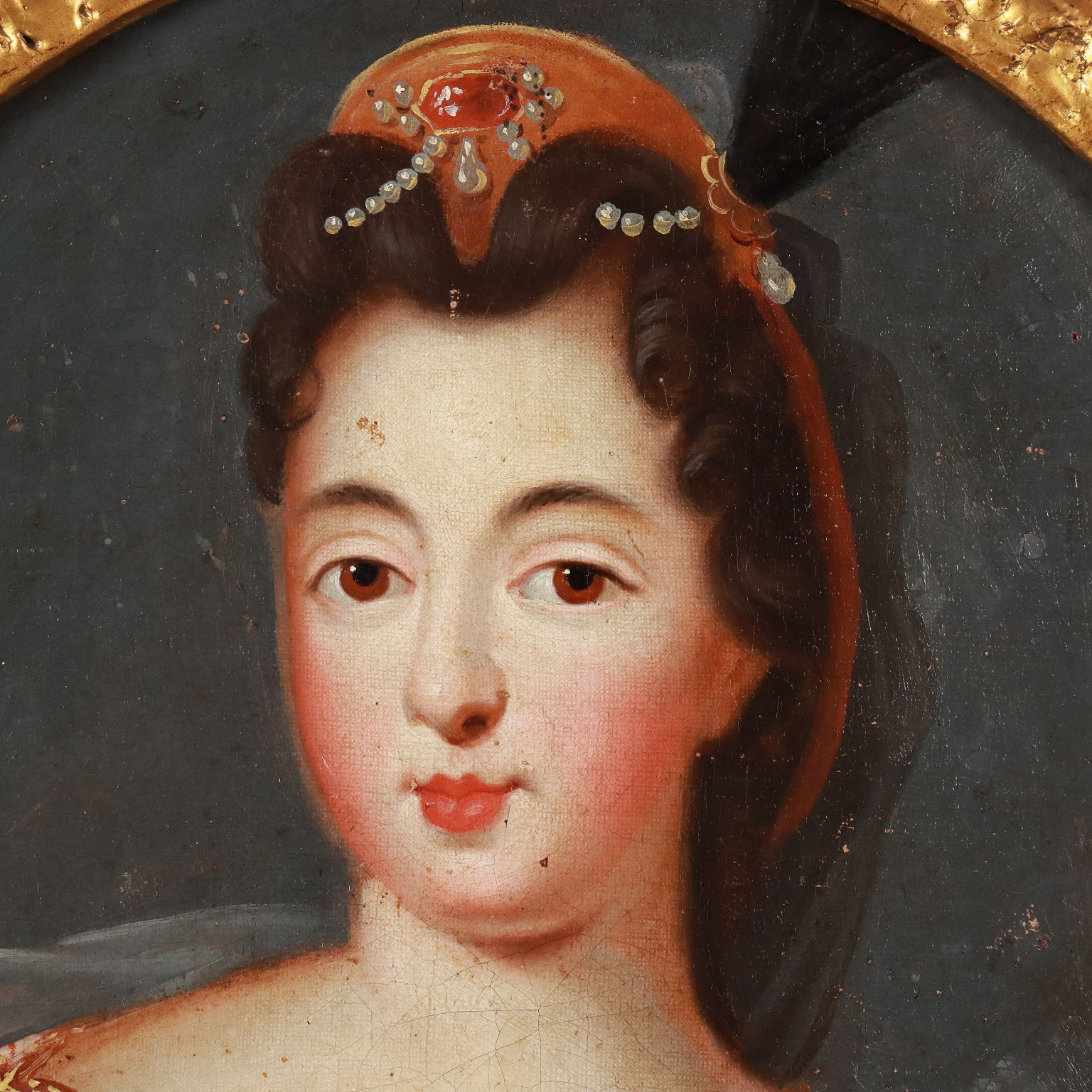 Peinture à l'huile sur toile. Portrait d'une jeune femme vêtue d'une robe élégante, enrichie de bijoux et de dentelles. Il fait partie d'une série de petits portraits de messieurs et de dames, de taille identique et présentés dans les mêmes cadres anciens. L'oeuvre est sur la première toile, cependant elle comporte peu et de très petites gouttes de couleur.