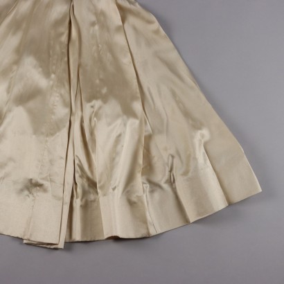 Robe de soirée ou de cérémonie en satin. C'est un modèle tailleur réalisé sur mesure, composé d'un corsage avec un gros nœud et d'une jupe plissée. Porte une taille italienne 40 (longueur 108 cm, taille 66 cm).