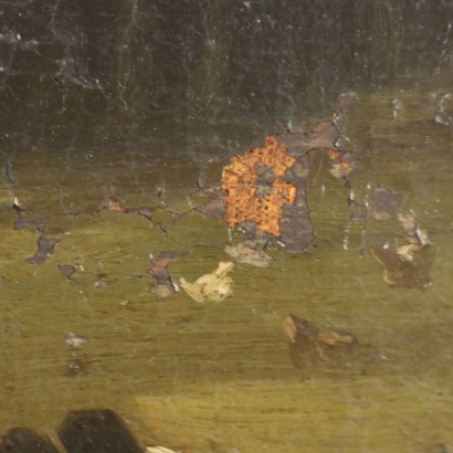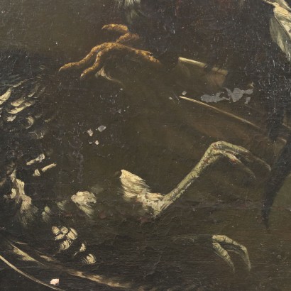 Peinture à l'huile sur toile. Dans un jardin, parmi d'autres poules qui grattent, un combat a lieu entre un coq et une dinde. Les tons chromatiques, dans les gammes de couleurs brunes, créent une atmosphère uniforme, où la seule lumière provient du ciel couchant en arrière-plan. La toile a de petites gouttes de couleur dans la partie inférieure. Dans le cadre de la bande.