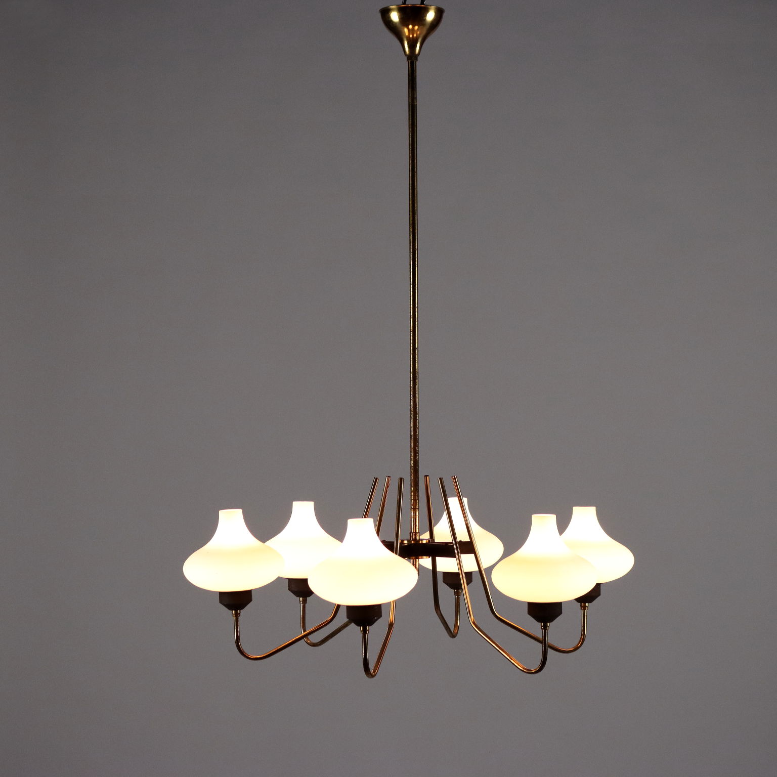 Plafonnier en laiton et aluminium émaillé avec diffuseurs en verre opale; lampe originale au style incomparable avec 6 points lumineux, idéale comme point lumineux central pour un environnement de vie qui veut rappeler le style Vintage des années 50-60.