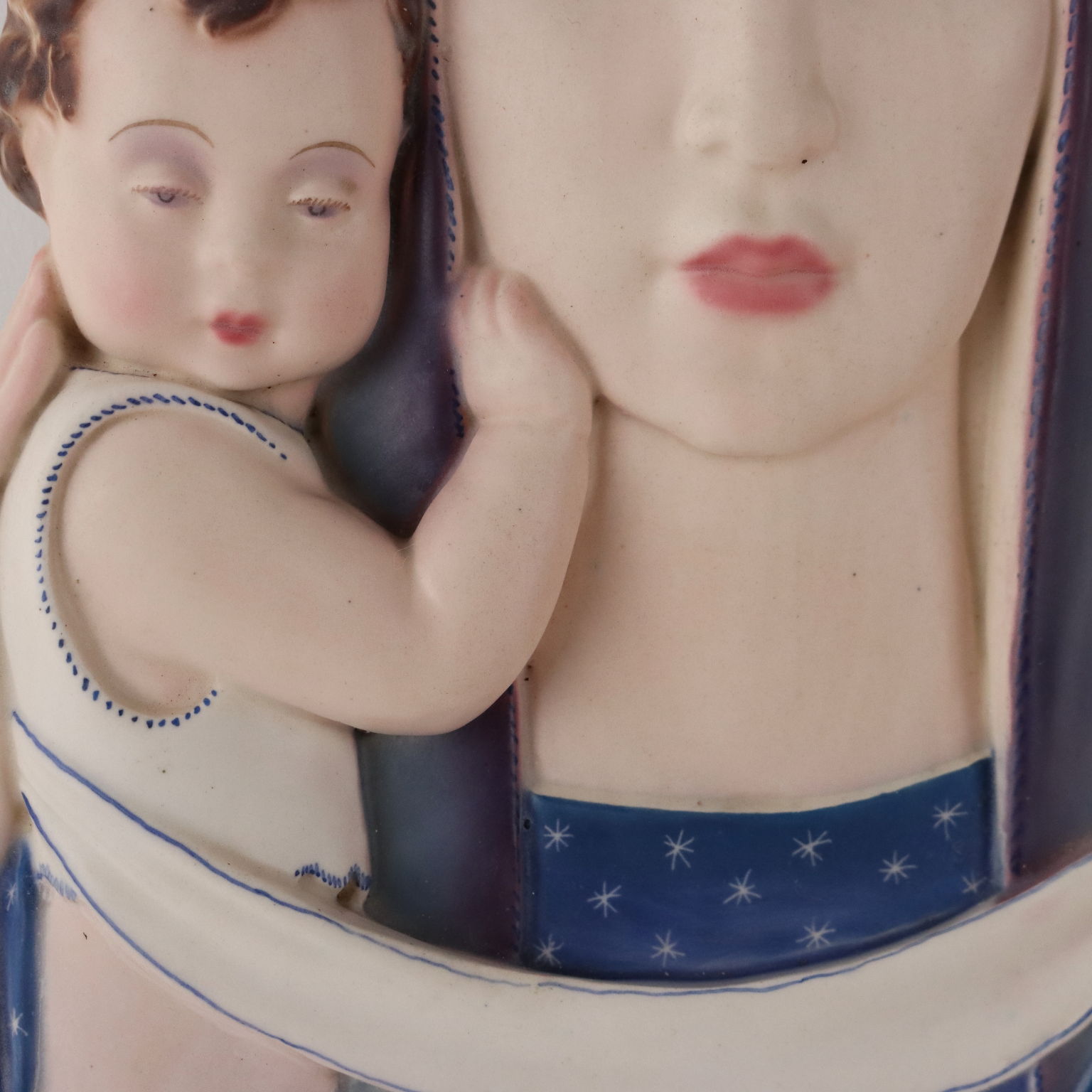 Vierge à l'Enfant en céramique polychrome. Au dos marque de la manufacture "Ceramica d'Arte La Freccia di Tarcisio Tosin".