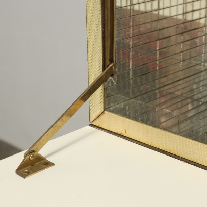 Meuble avec porte abattante pour compartiment bar et tiroirs sous dessus visible. Bois de hêtre massif, placage d'acajou et bois recouvert de Formica. Un meuble de bar très original, avec une ligne typique des années 50, un meuble pour un espace de vie au style résolument vintage et pour donner une nouvelle vie aux choses.