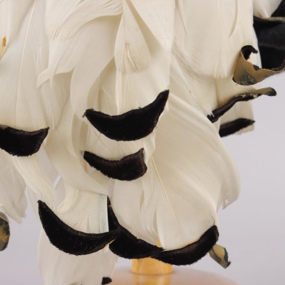 Chapeau en velours noir avec applications de plumes blanches. C'est un modèle de casquette simple, mais élaboré avec des plumes décorées de morceaux de tissu, pour créer un jeu en noir et blanc. La circonférence est de 52 cm.