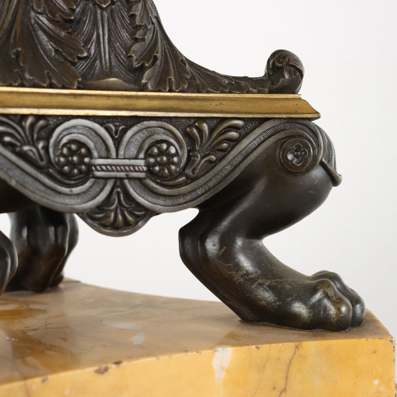 Paire de flambeaux en bronze ciselé, doré et bruni. Sur une base triangulaire en bronze doré et marbre jaune de Sienne repose un flambeau à cinq flammes aux pieds pattes sauvages.