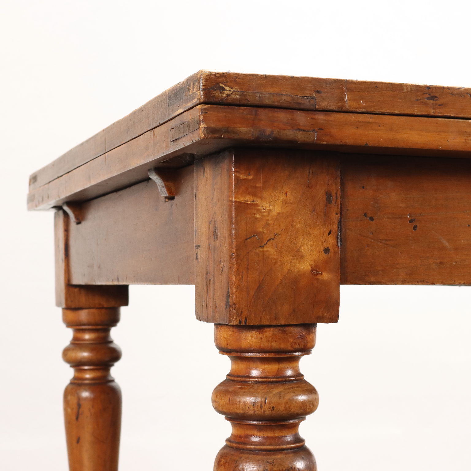 Table gextensible en peuplier avec rallonges disposées sous le plateau et pieds tournés. Italie milieu du 19ème siècle