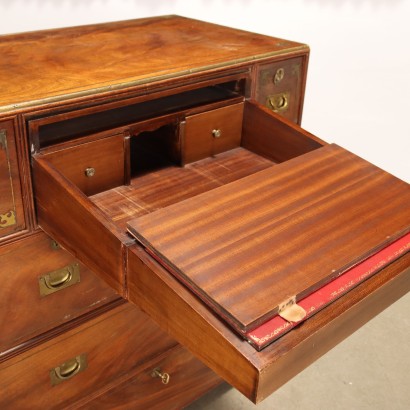 Bureau marin fini ouvert avec 7 tiroirs de différentes tailles. La bande centrale sous le plateau est double et présente un insert en cuir rouge qui s'ouvre des deux côtés : d'un côté elle cache un compartiment secret avec de petits tiroirs et de l'autre elle contient un compartiment vide. Angleterre 20ème siècle
