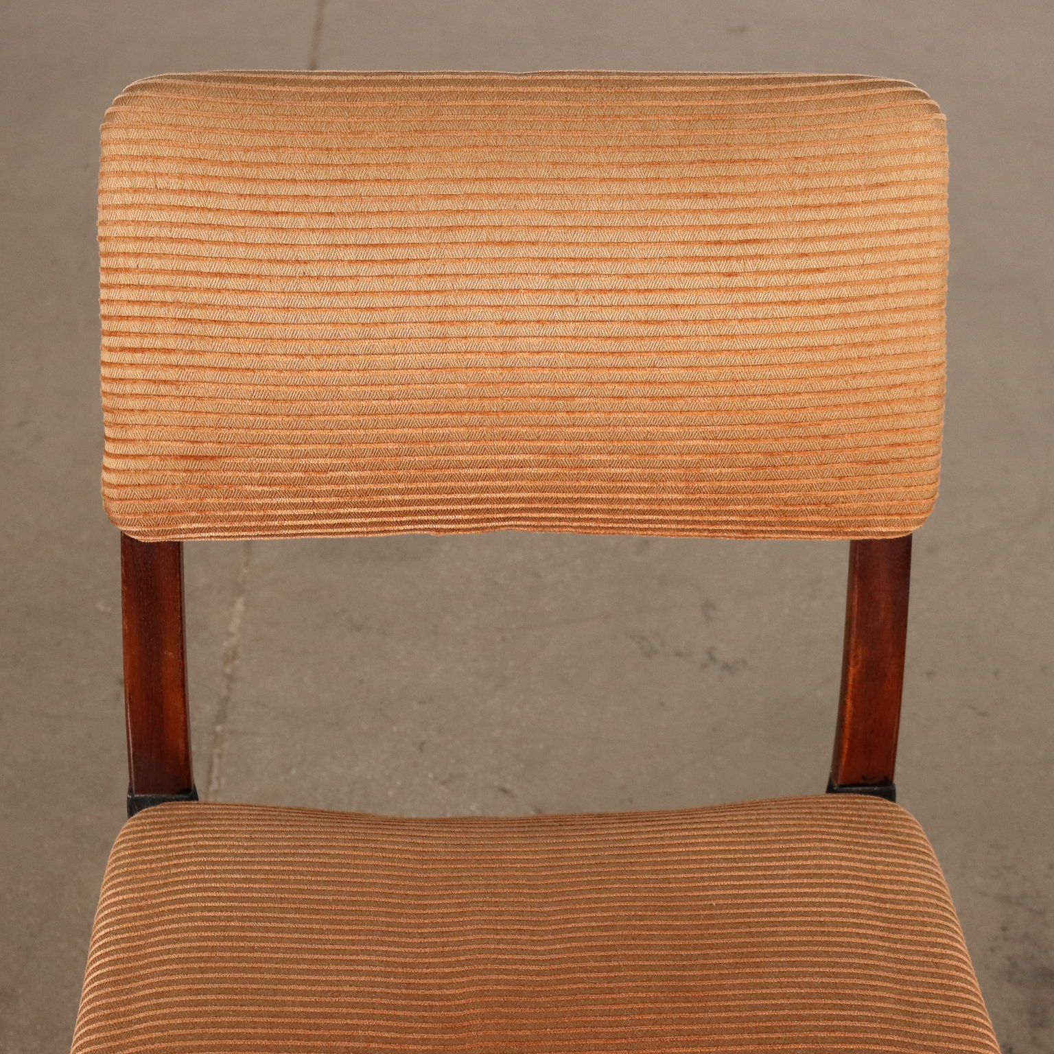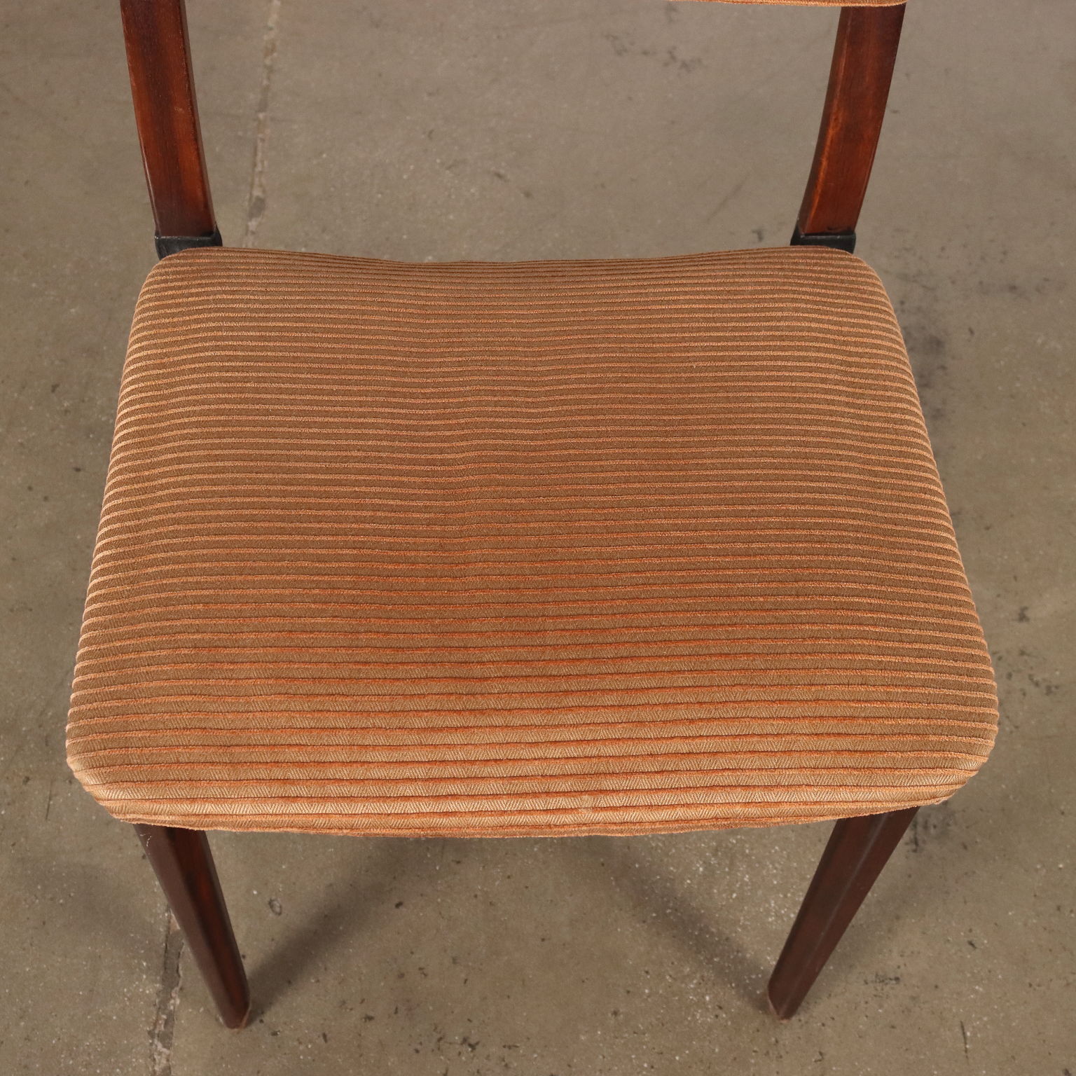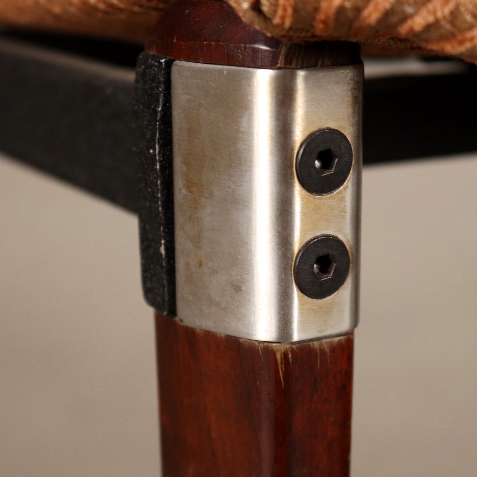 Groupe de 6 chaises avec structure en bois exotique, métal chromé et émaillé, rembourrage en mousse et revêtement en tissu.