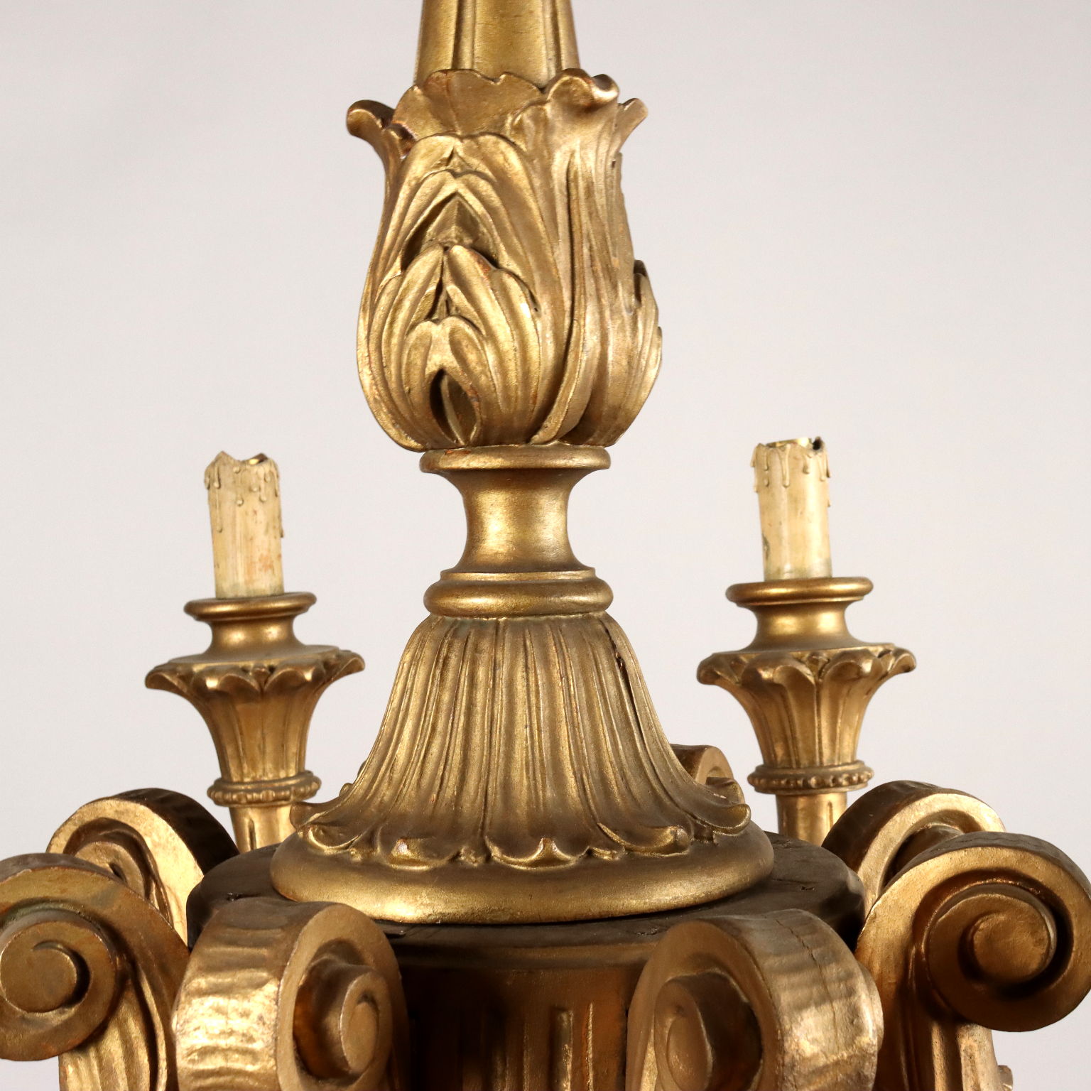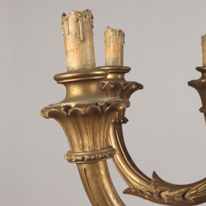 Lustre à huit lumières à structure en bois sculpté et doré, tige à décor d'éléments feuillagés et bras portant des éléments frisés. Italie milieu du XXe siècle