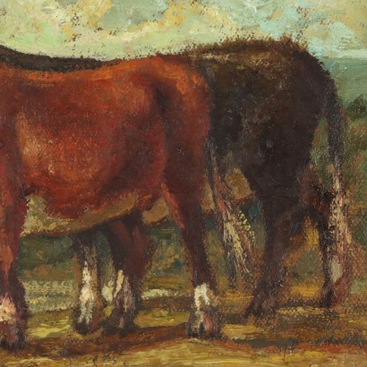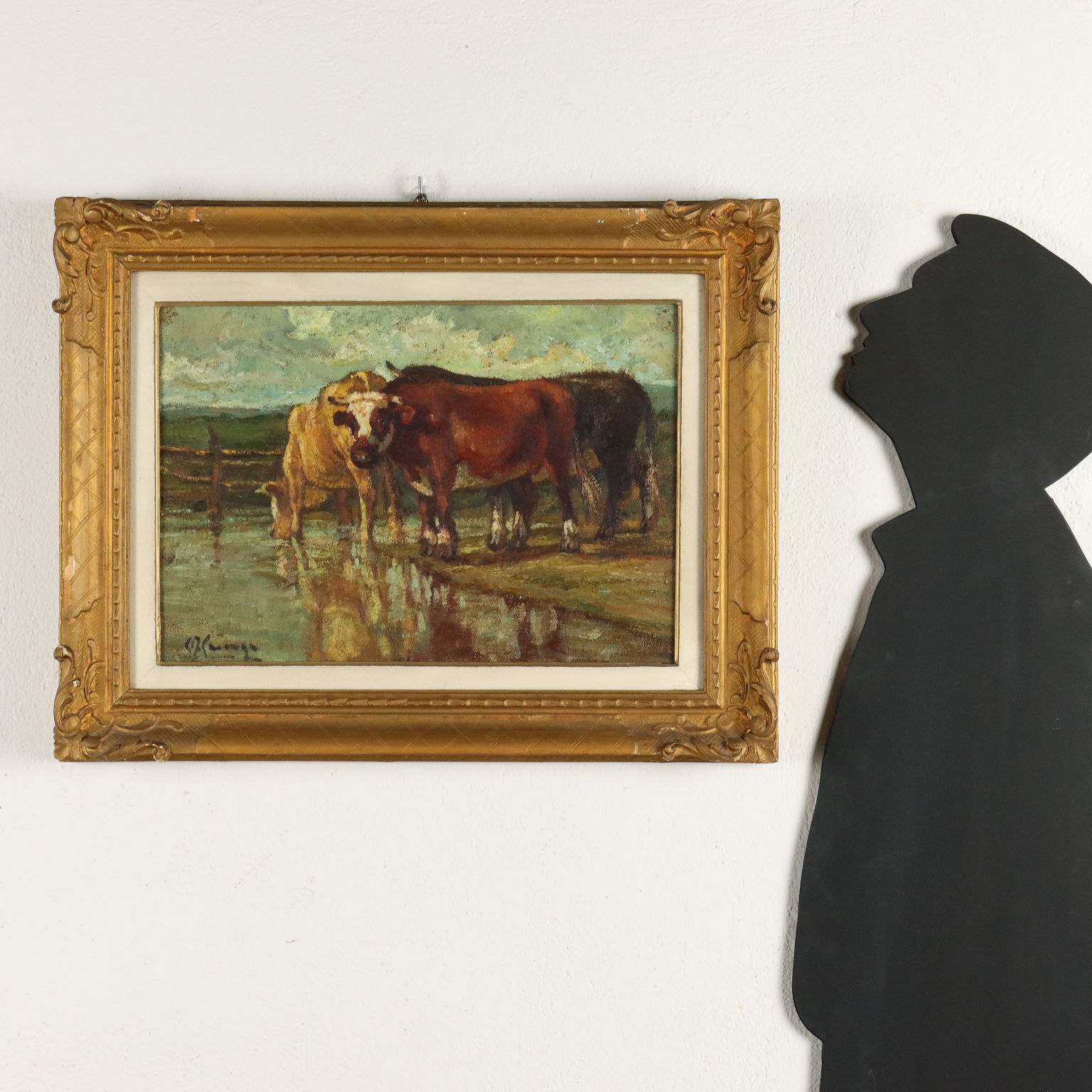 Peinture à l'huile sur toile. Signé en bas à gauche. Au dos il y a une étiquette avec le titre. Artiste milanais autodidacte, Giovan Francesco Gonzaga a déclaré "mon véritable professeur est la nature", et fidèle à elle, il s'est consacré principalement aux scènes avec des chevaux (une passion héritée de son expérience dans la cavalerie de Savoie pendant la guerre) aux paysages et encore des vies, toujours représentées "en plein air". Vittorio Sgarbi a écrit à son sujet : « La sagesse de Giovan Francesco Gonzaga réside dans le dessin, qui est fort et décisif..... Les images vibrent d'inquiétude, dans le signe de la lutte de l'homme contre lui-même, dans l'enfer d'une histoire. qui semble toujours répéter le même drame. Mais si le dessin préparatoire est admirable, la couleur de cet artiste a une royauté et une sensibilité qui proviennent d'une perception musicale de la couleur, où la palette s'exprime en changements brusques et en rythmes de boutons". Ces intensités chromatiques se retrouvent dans ce portrait de quelques vaches au point d'abreuvement : les nuances du ciel, de la terre et de l'eau se poursuivent et se mélangent autour des silhouettes des bêtes, qui s'intègrent harmonieusement en elles. Œuvre présentée dans un cadre.