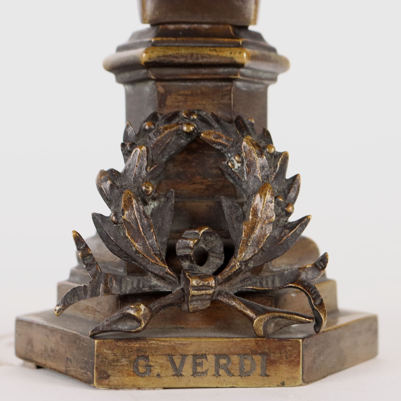 Demi-buste en bronze représentant Giuseppe Verdi soutenu par une colonne à base hexagonale sur laquelle repose une couronne de laurier.