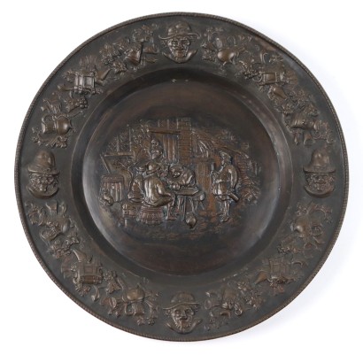 Paire de plaques de parade en tôle de bronze repoussé. Le bord est orné de panoplies et d'un visage d'homme coiffé d'un chapeau. Au centre scène dans une taverne avec des personnages.