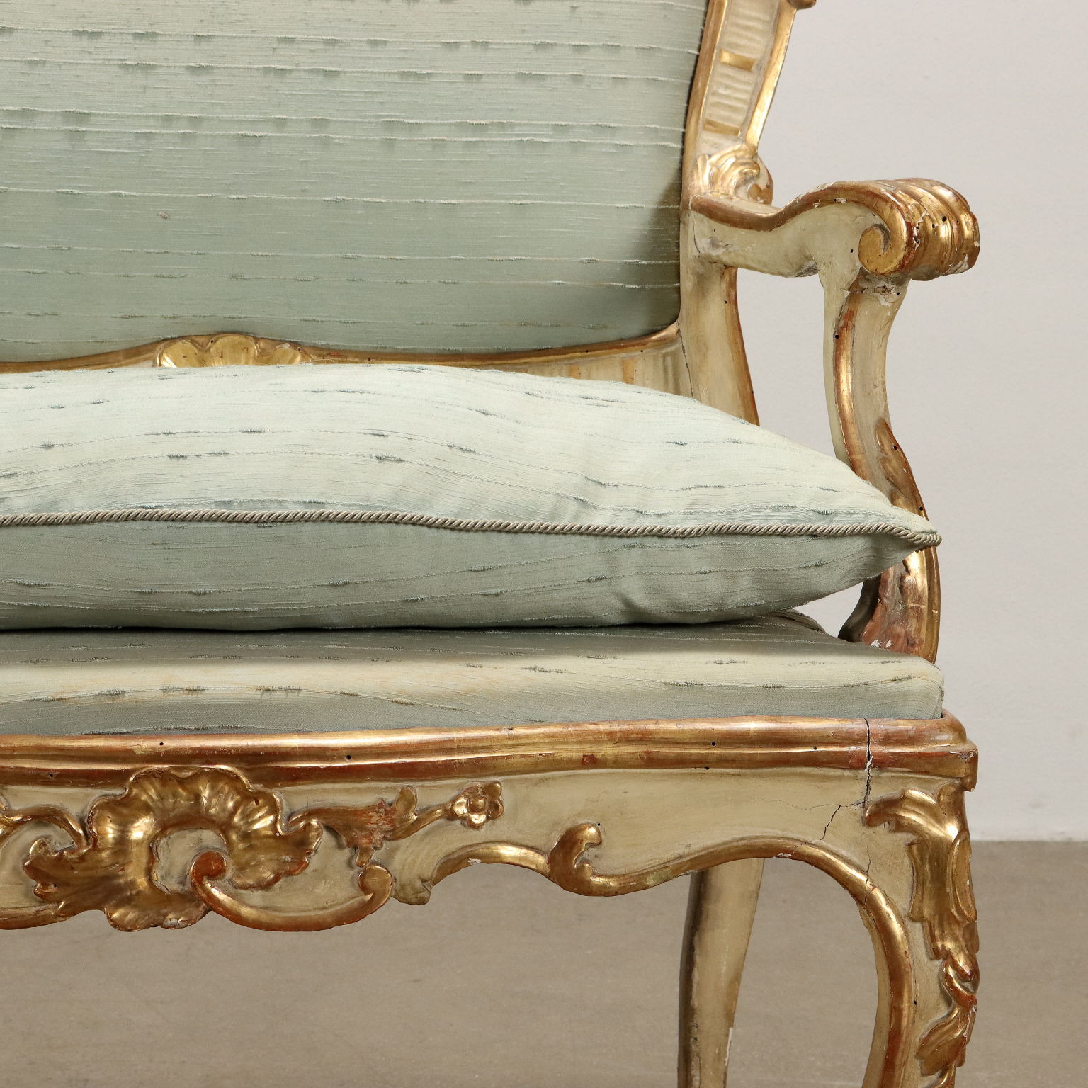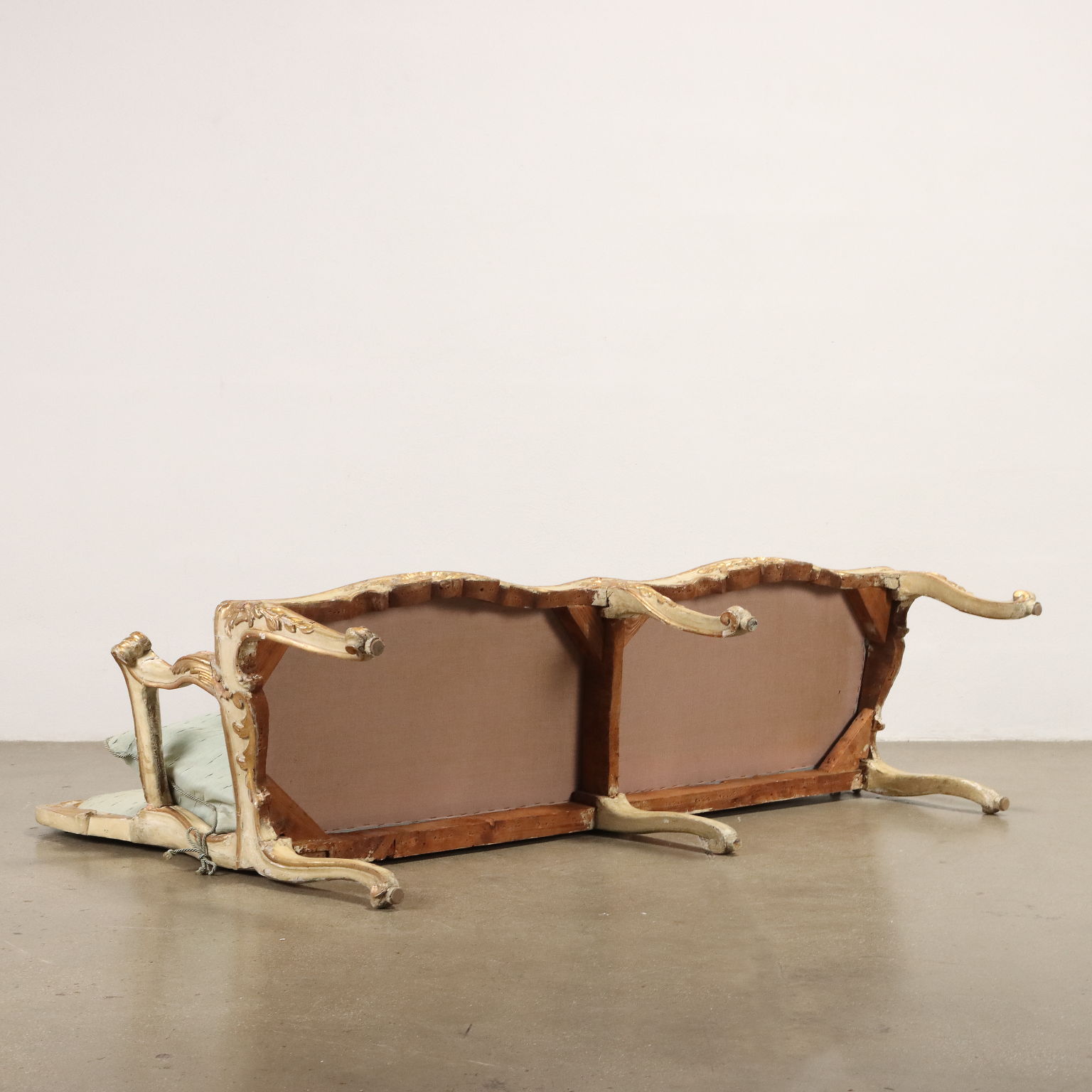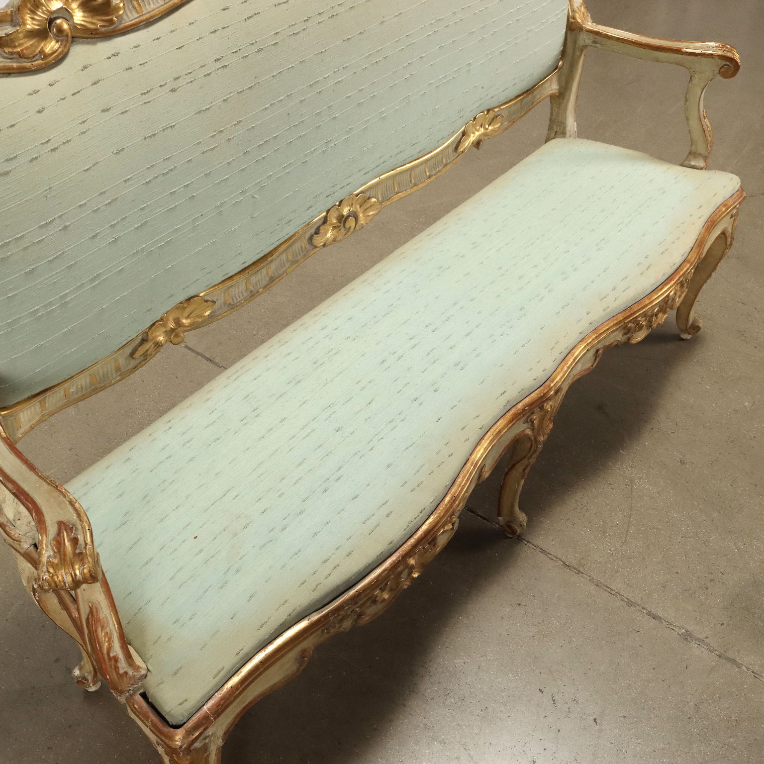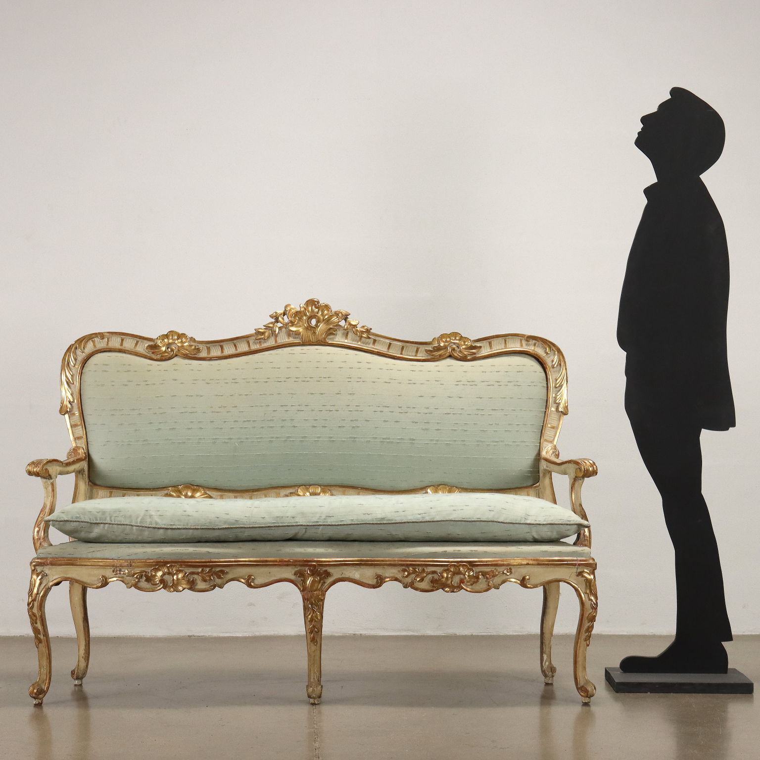 Canapé en bois doré, sculpté et laqué à dossier orné de cymatium sculpté figurant une coquille dans une couronne feuillagée et de motifs latéraux rocaille. Dossier et assise rembourrés. Accoudoirs, bande sous l'assise et pieds ondulés et sculptés. Italie milieu du 19ème siècle