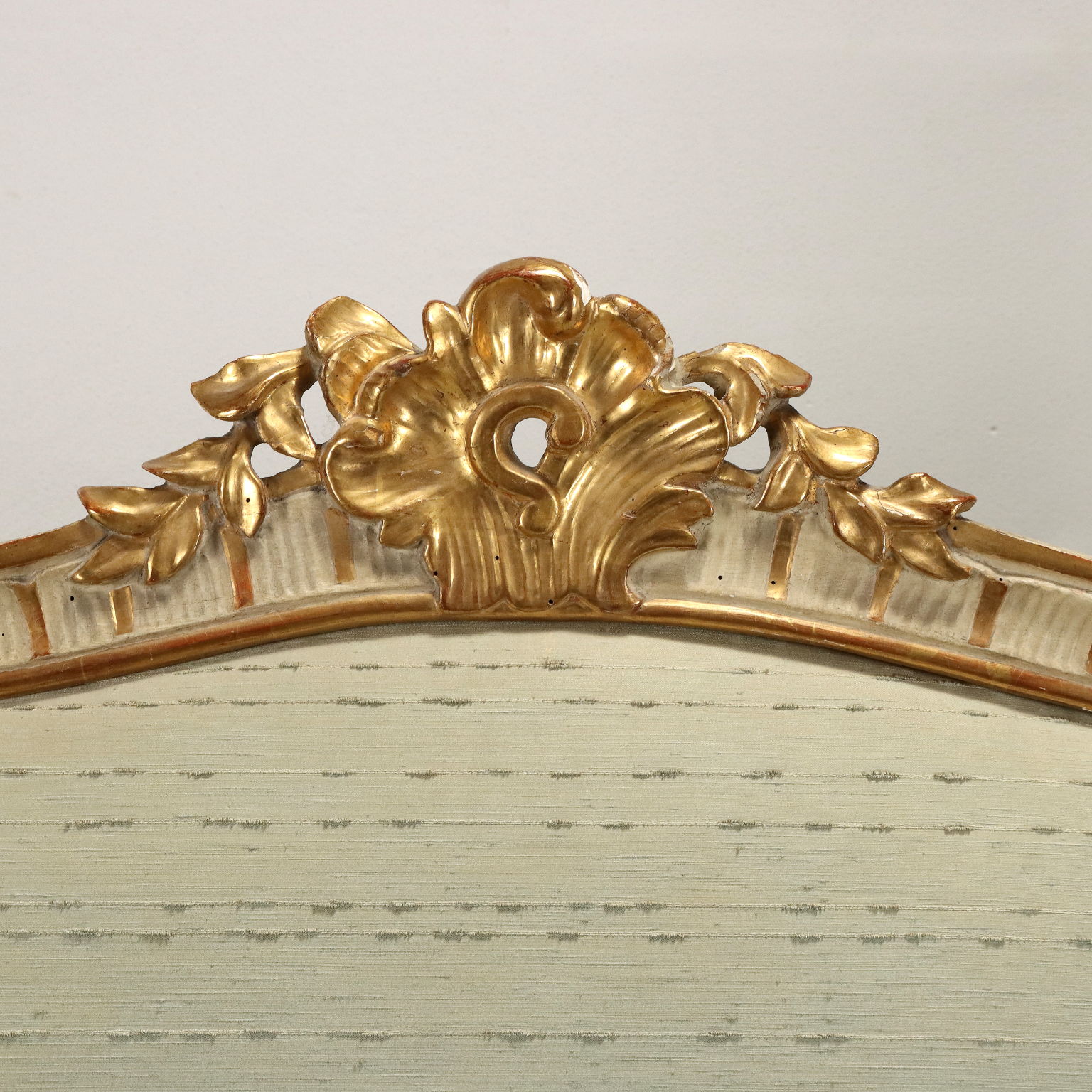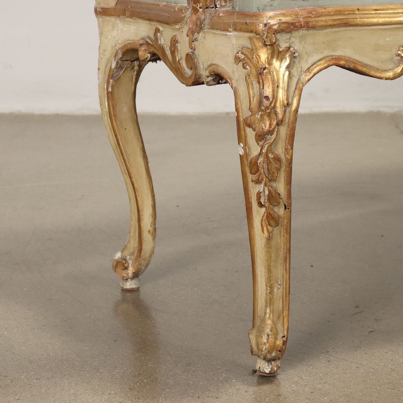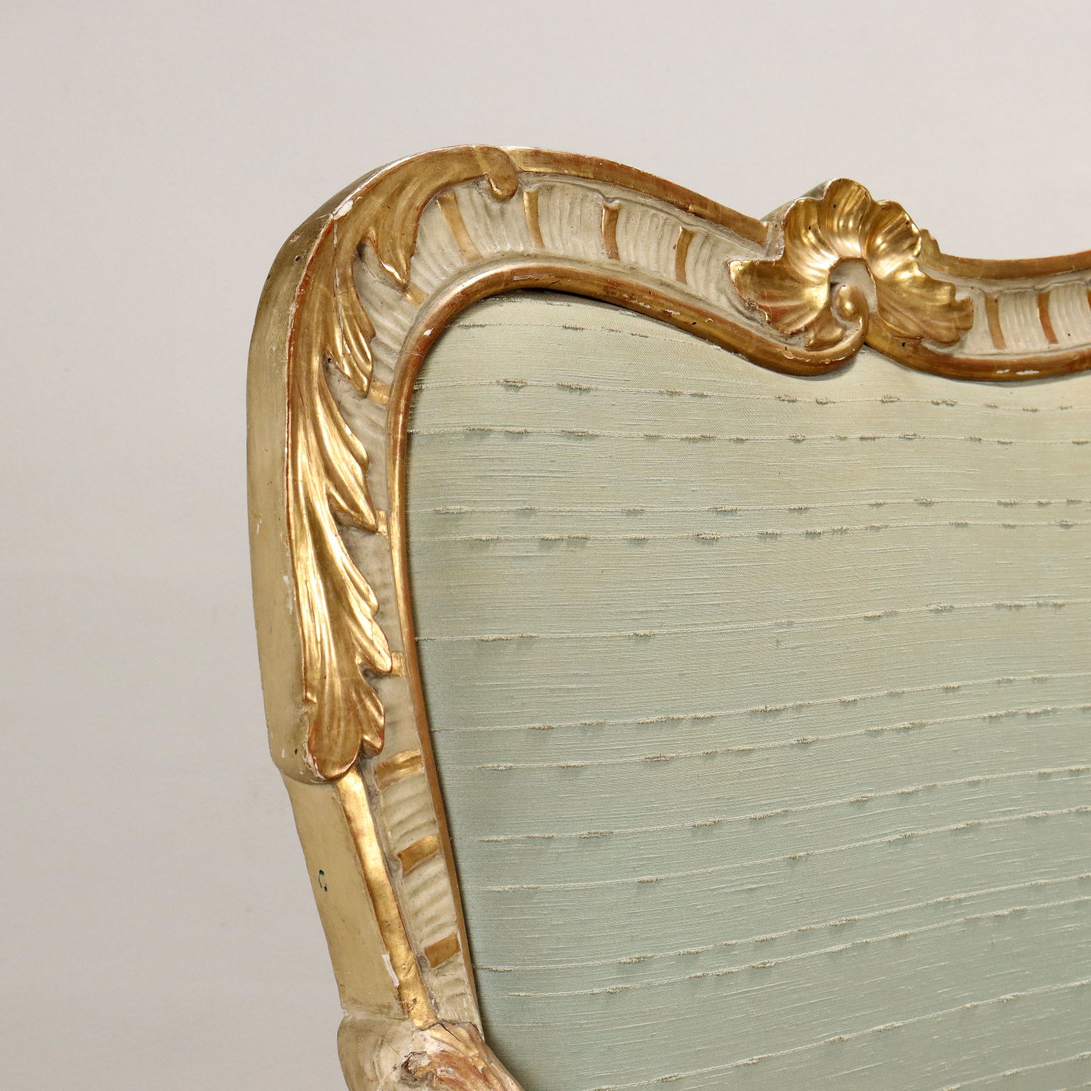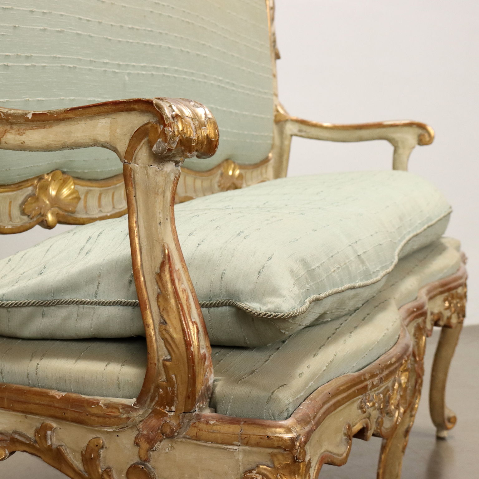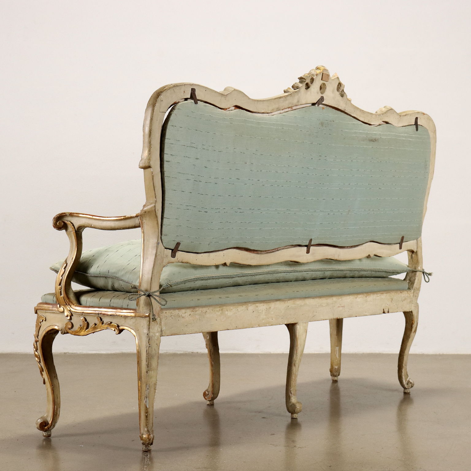 Canapé en bois doré, sculpté et laqué à dossier orné de cymatium sculpté figurant une coquille dans une couronne feuillagée et de motifs latéraux rocaille. Dossier et assise rembourrés. Accoudoirs, bande sous l'assise et pieds ondulés et sculptés. Italie milieu du 19ème siècle