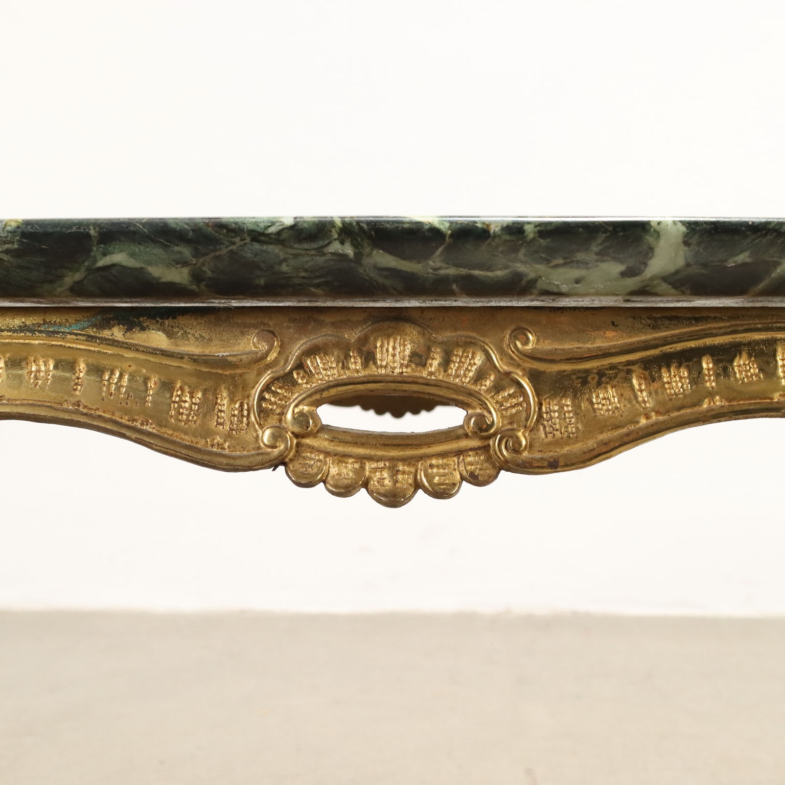 Table basse vintage de fabrication italienne avec structure en laiton et plateau en marbre dans les tons verts.