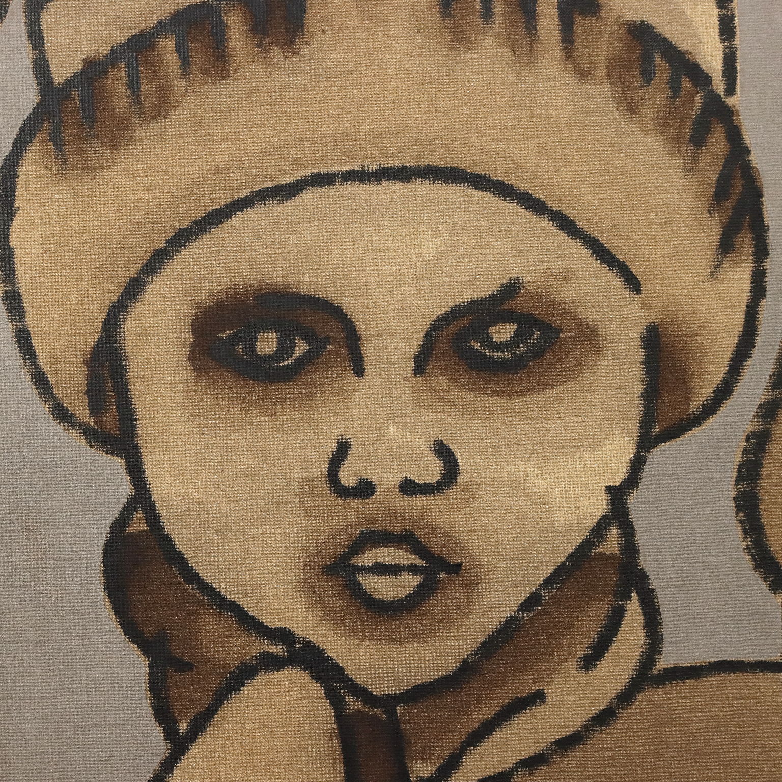 Huile et acrylique sur toile. Signature, date et titre au dos. Concetto Pozzati était un artiste éclectique : après ses débuts dans le climat informel, l'artiste a retravaillé les influences du Pop Art international dans une touche personnelle, en restant toujours lié à une figuration simplifiée et ironique, aux atmosphères surréalistes. L'œuvre présentée appartient à la série des Albums de Famille de 2001, dans laquelle l'artiste représente les visages des membres de sa famille : ici le même artiste apparaît, à gauche, flanqué des visages enfantins de ses deux enfants, et en plus de la tête de un coq, conformément à l'habitude de Pozzati d'ajouter des éléments de la vie quotidienne dans ses œuvres.